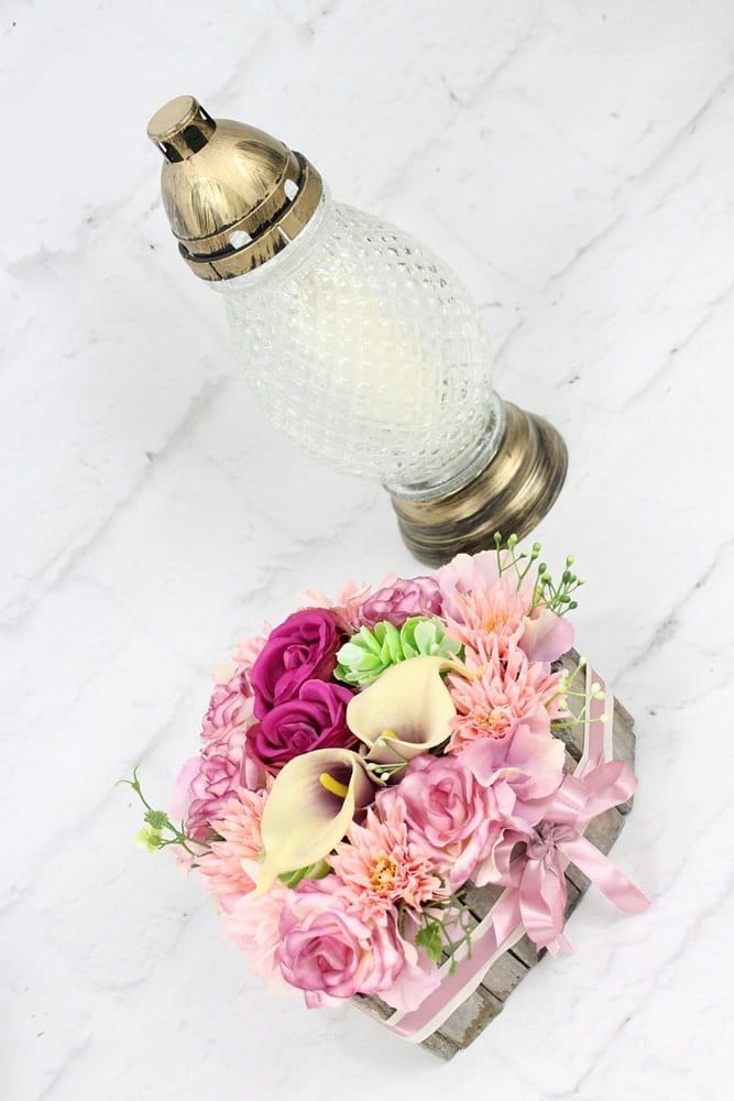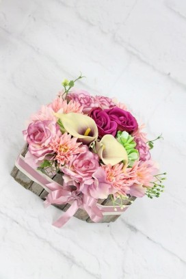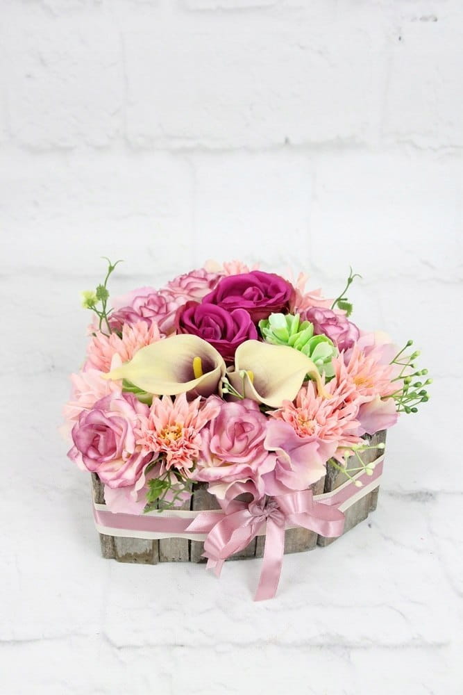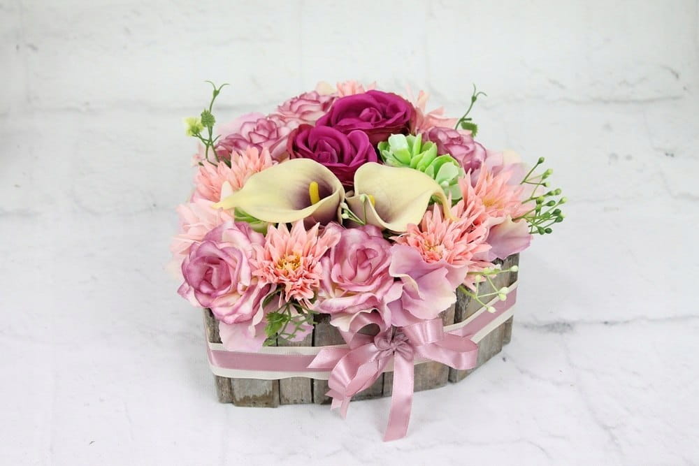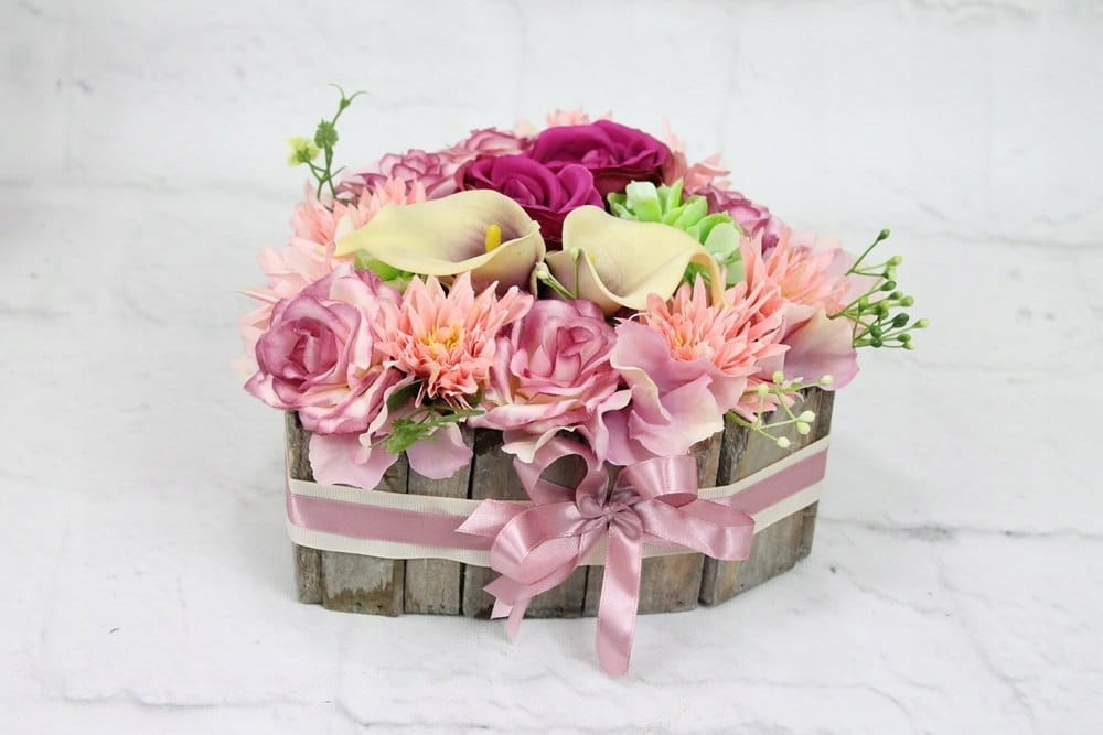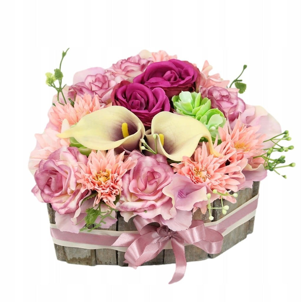 Niezwykle piękna i oryginalna kompozycja nagrobna w kształcie serca, wykonana z wysokiej jakości sztucznych kwiatów w naturalnej podstawie drewnianej.
