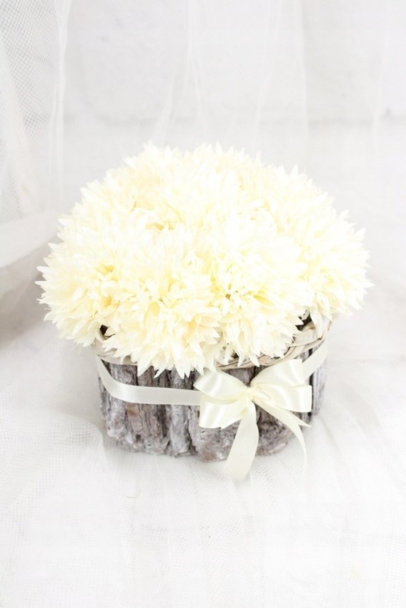 Niewielka, piękna i oryginalna kompozycja nagrobna w kształcie serca, wykonana z wysokiej jakości sztucznych kwiatów chryzantemy w naturalnej podstawie z kory.