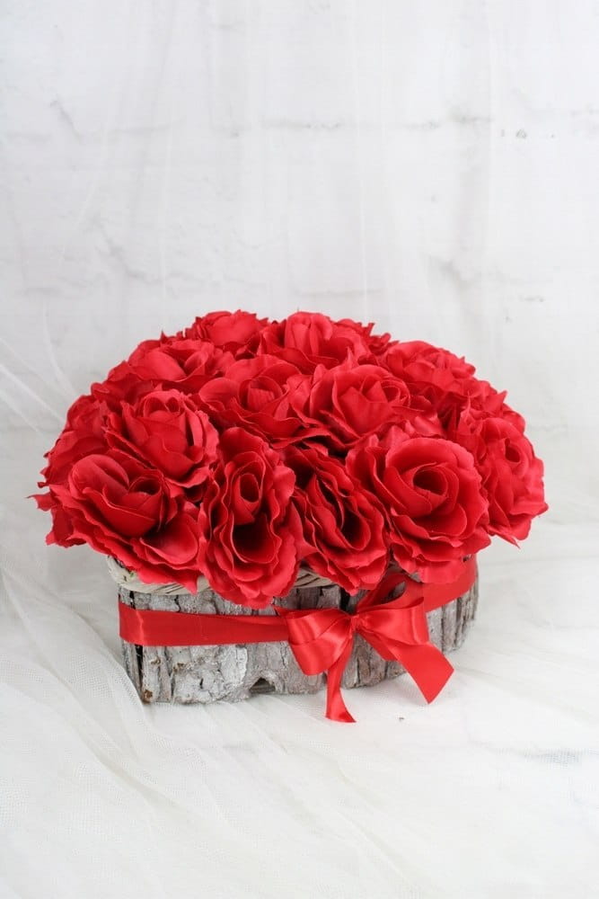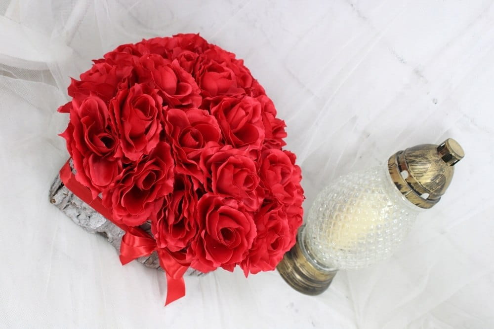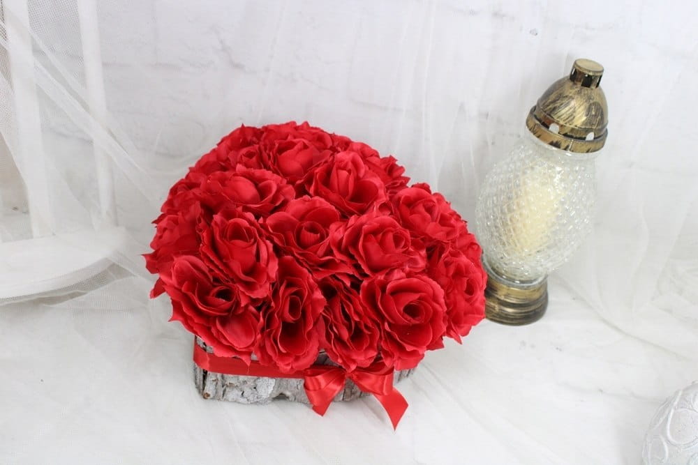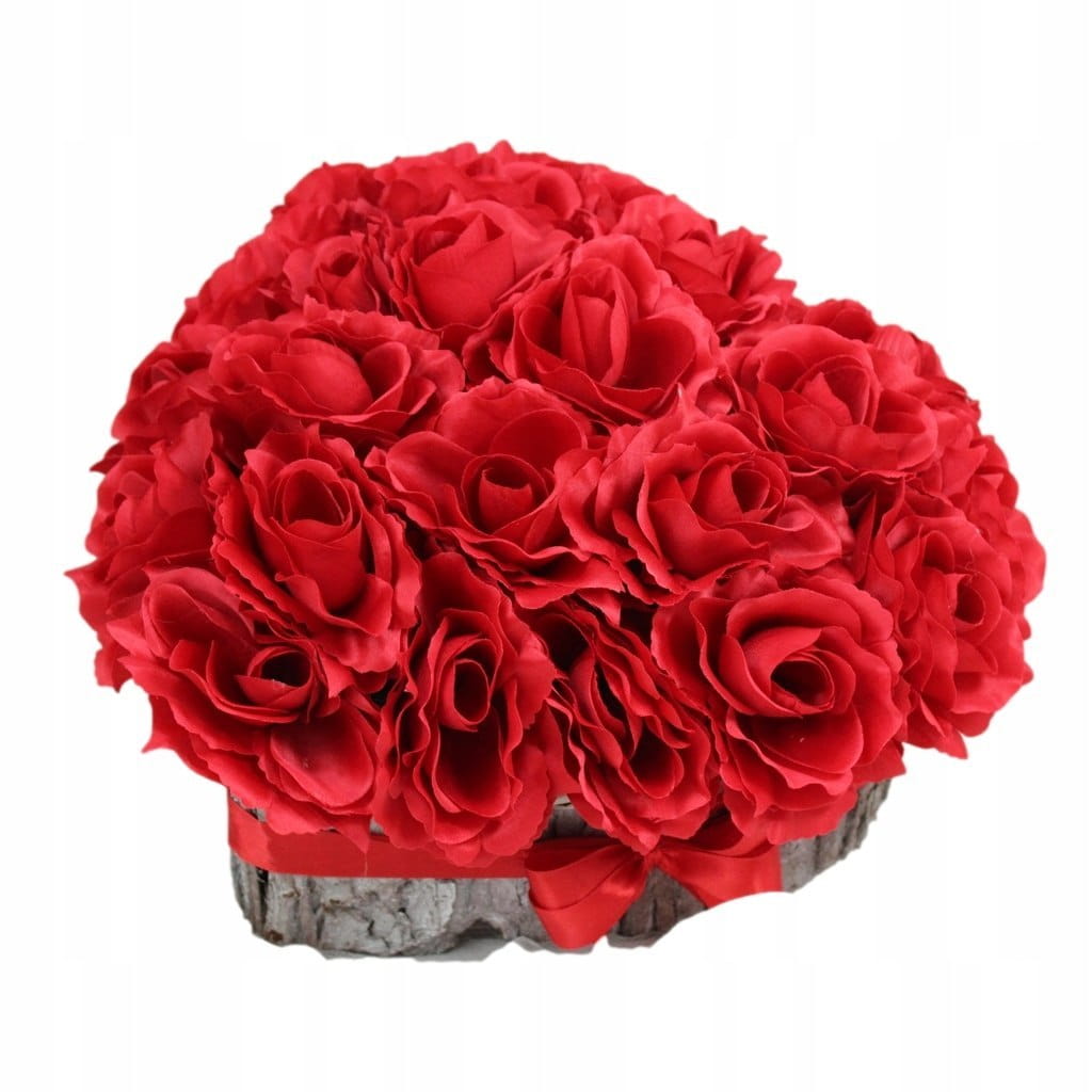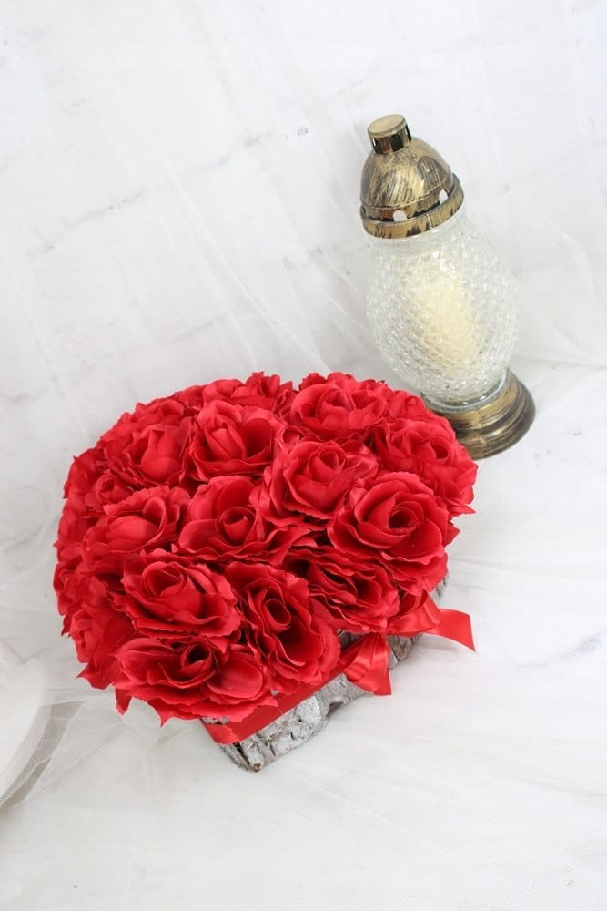 Niezwykle piękna, duża i oryginalna kompozycja nagrobna w kształcie serca, wykonana z wysokiej jakości sztucznych kwiatów czerwonych róż w naturalnej podstawie z kory.