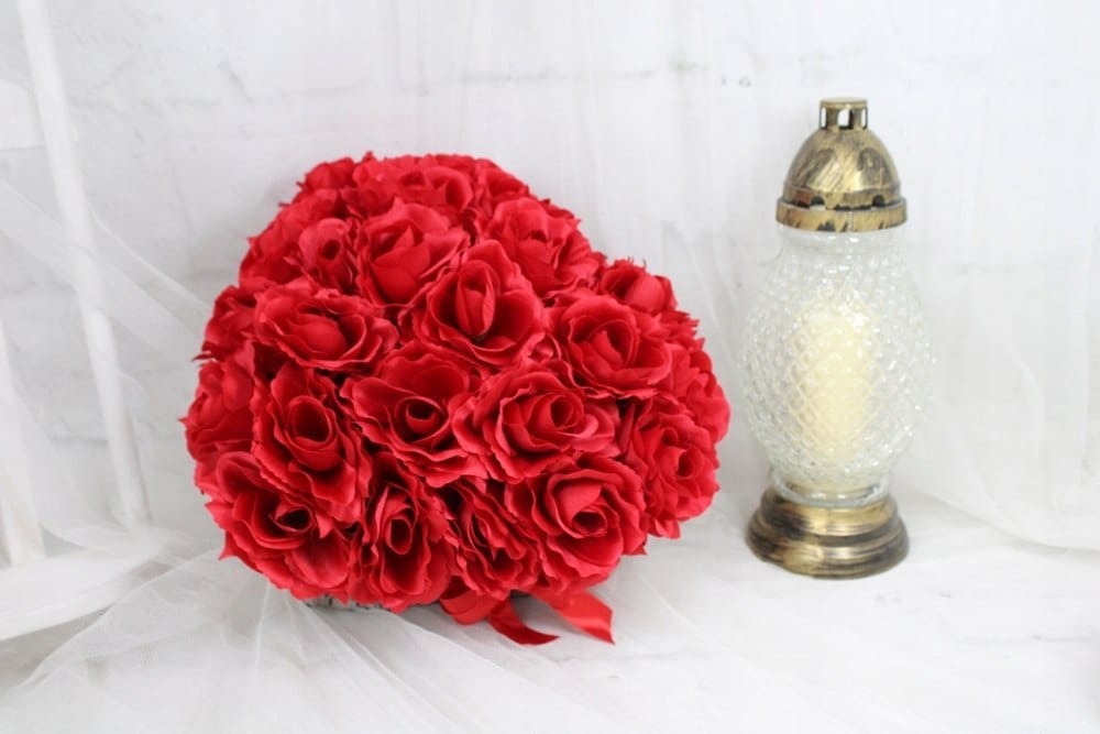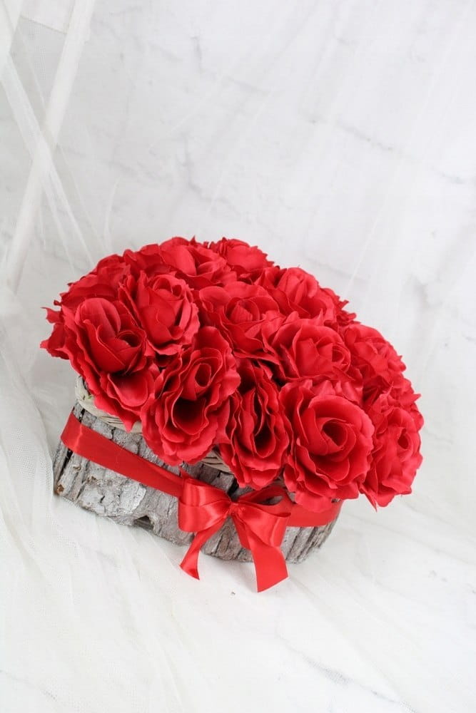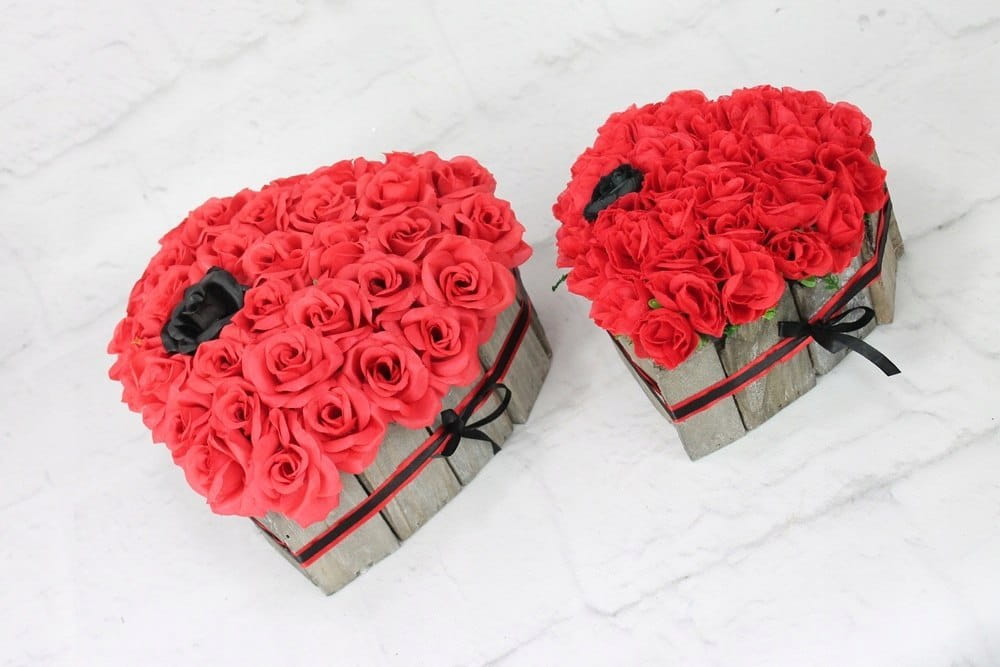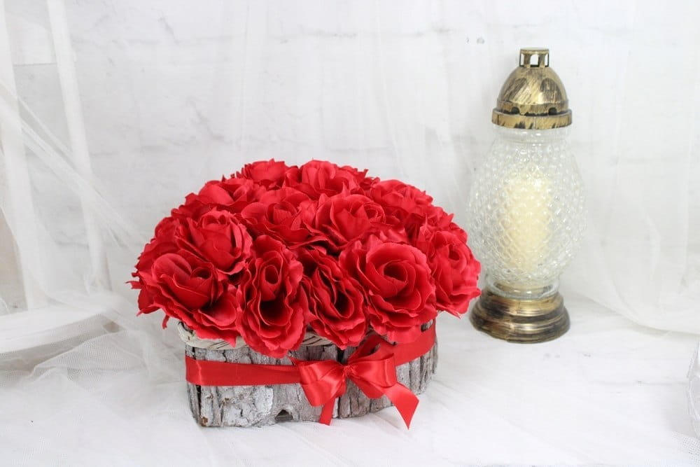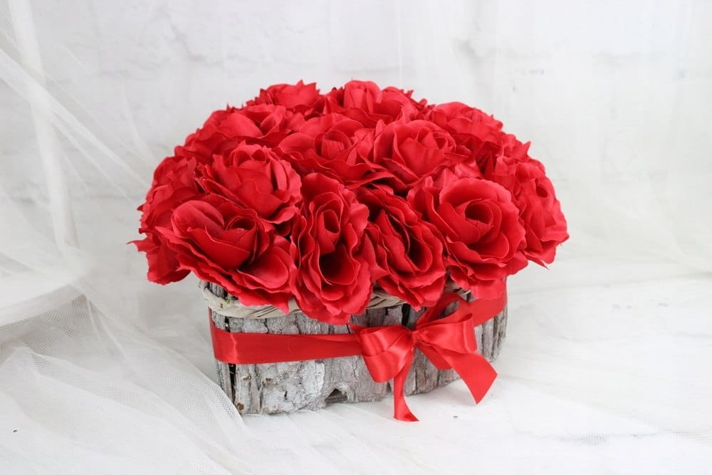 Niezwykle piękna, duża i oryginalna kompozycja nagrobna w kształcie serca, wykonana z wysokiej jakości sztucznych kwiatów czerwonych róż w naturalnej podstawie z kory.