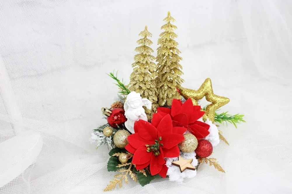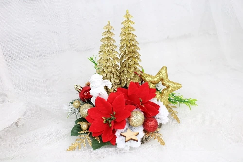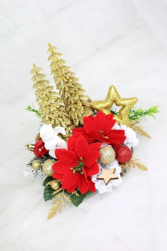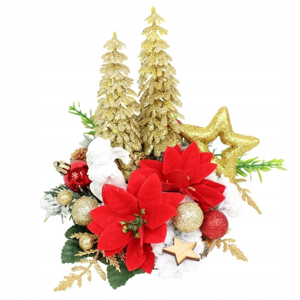 Całość jest utrzymana w tonacji złota i czerwieni, udekorowana naturalnie wyglądającymi sztucznymi gałązkami oraz pięknymi świątecznymi dodatkami, idealnie wpisująca się w trendy świąteczne.
