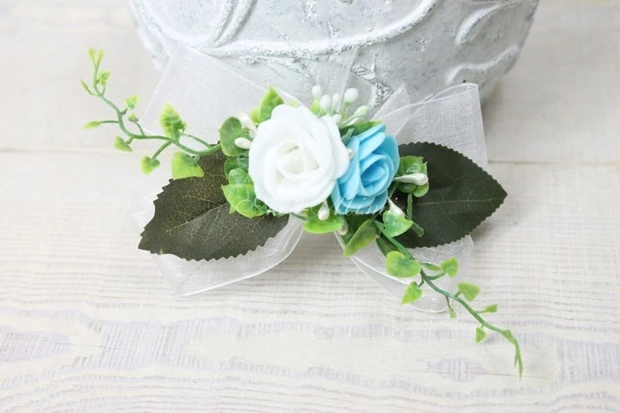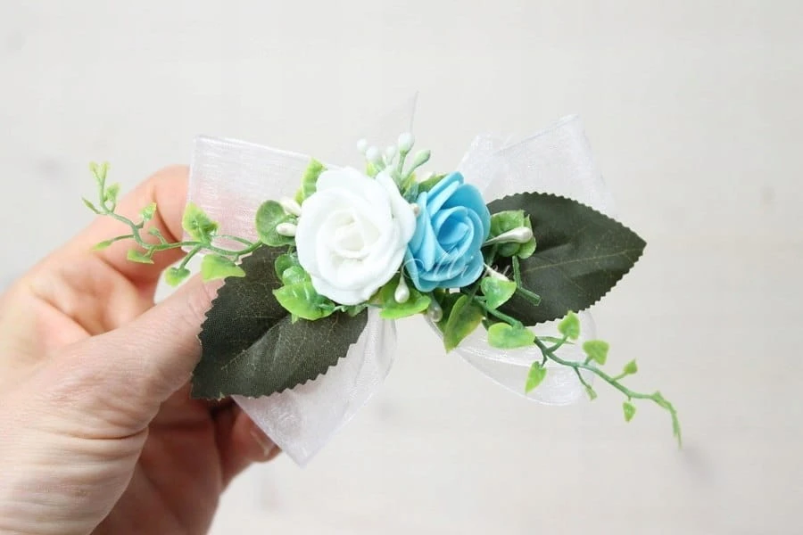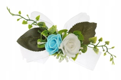 Śliczna i bardzo efektowna ozdoba na torebkę komunijną, wykonana z biało niebieskich kwiatów róży, zdobiona perłowymi pręcikami perełek, delikatnymi listkami bluszczu, który swoim kształtem przypomina serduszka liśćmi oraz dekoracyjną trawką.