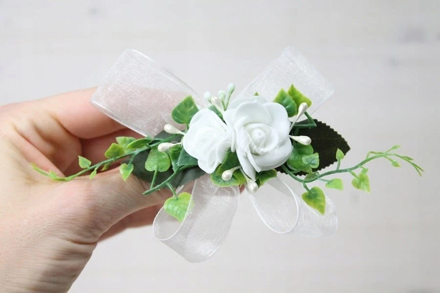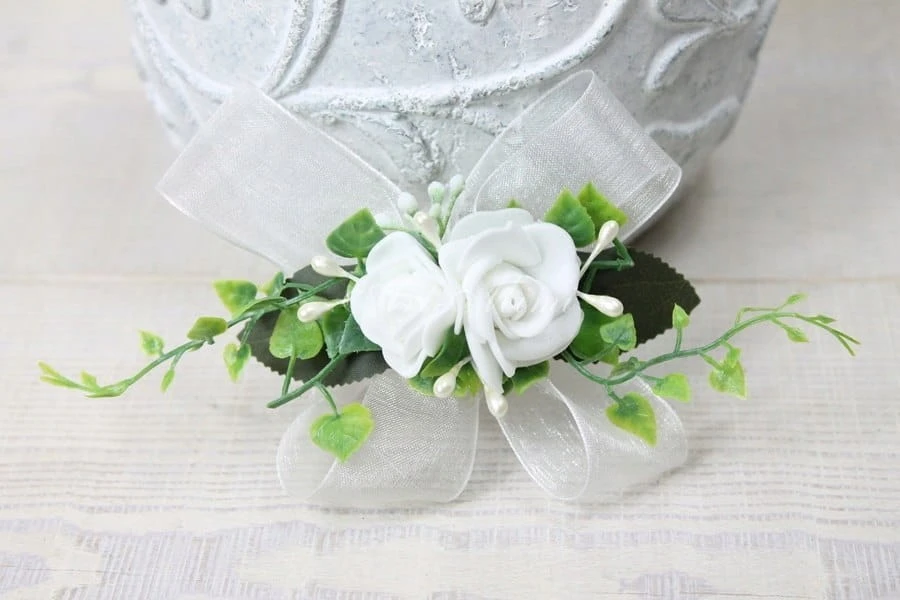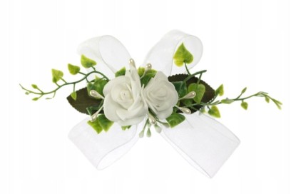 Śliczna i bardzo efektowna ozdoba na torebkę komunijną, wykonana z śnieżno białych kwiatów róży, zdobiona perłowymi pręcikami perełek, delikatnymi listkami bluszczu, który swoim kształtem przypomina serduszka liśćmi oraz dekoracyjną trawką.
