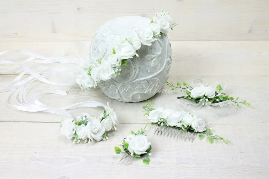 Na innych aukcjach można dokupić do kompletu równie piękny wianek, większy i mniejszy grzebyk, bransoletkę na rękę.