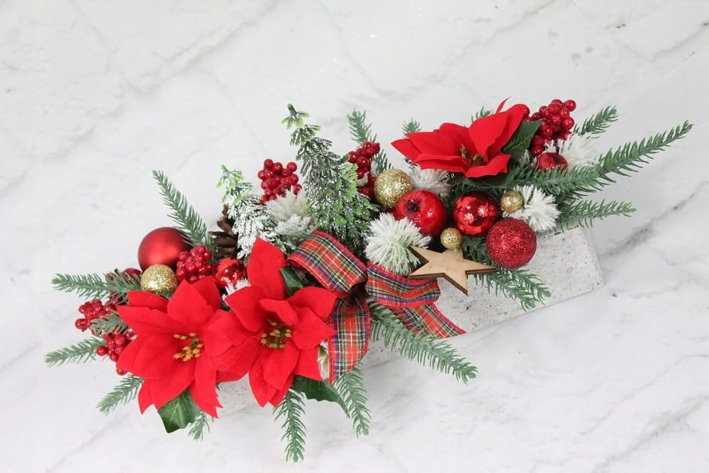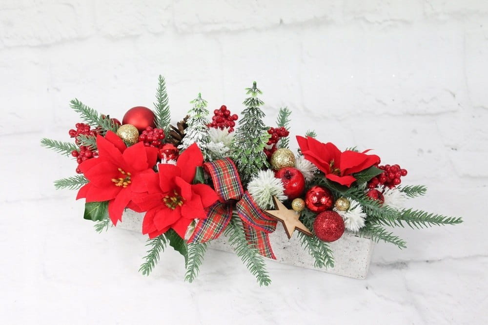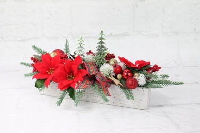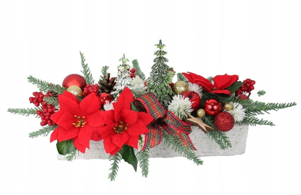 Całość jest utrzymana w tonacji złota i czerwieni udekorowana naturalnie wyglądającymi sztucznymi gałązkami oraz pięknymi świątecznymi dodatkami, idealnie wpisująca się w trendy świąteczne.