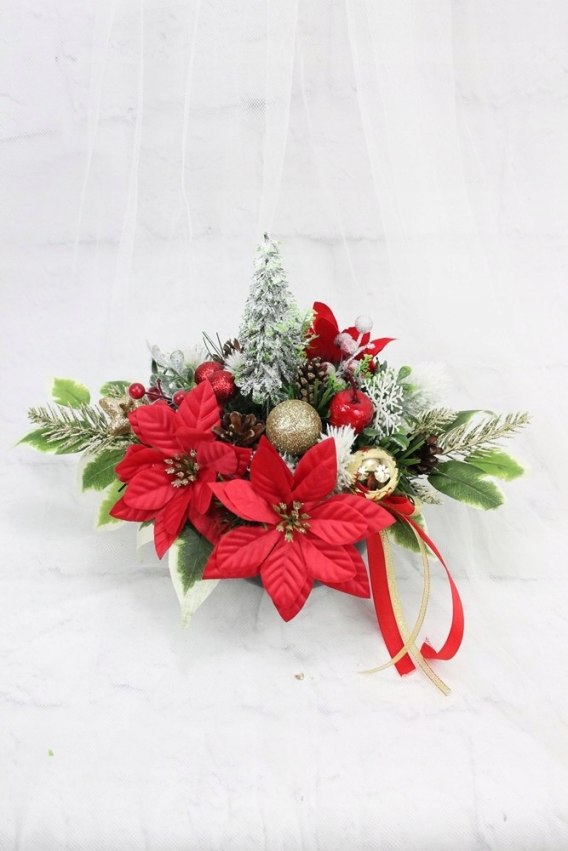 Całość jest utrzymana w tonacji złota i czerwieni udekorowana naturalnie wyglądającymi sztucznymi gałązkami oraz pięknymi świątecznymi dodatkami, idealnie wpisująca się w trendy świąteczne.