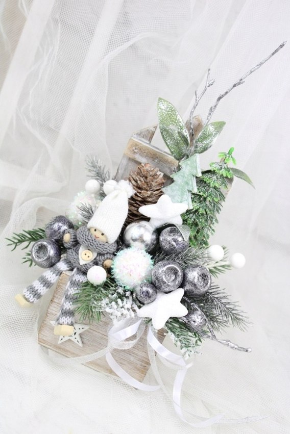 Stylowa dekoracja wprowadzająca do wnętrza ciepły, magiczny klimat świąt. Ręcznie wykonana z dbałością o detale, ozdobiona naturalnymi elementami, bombkami i subtelnymi akcentami w kolorach świątecznych. Idealna na stół, komodę, parapet.