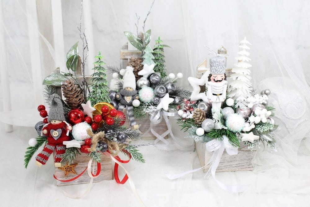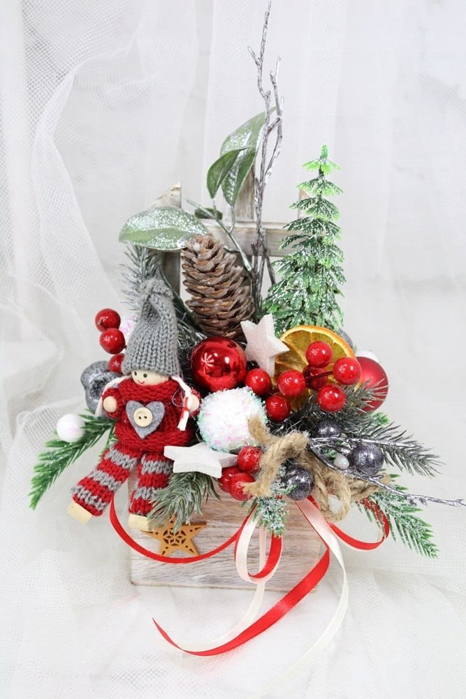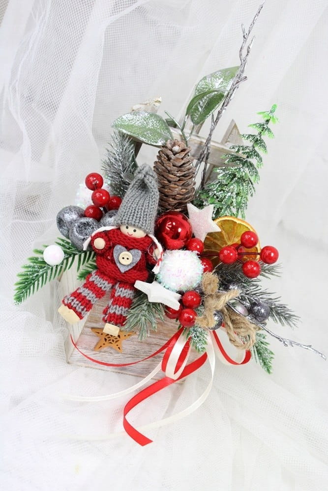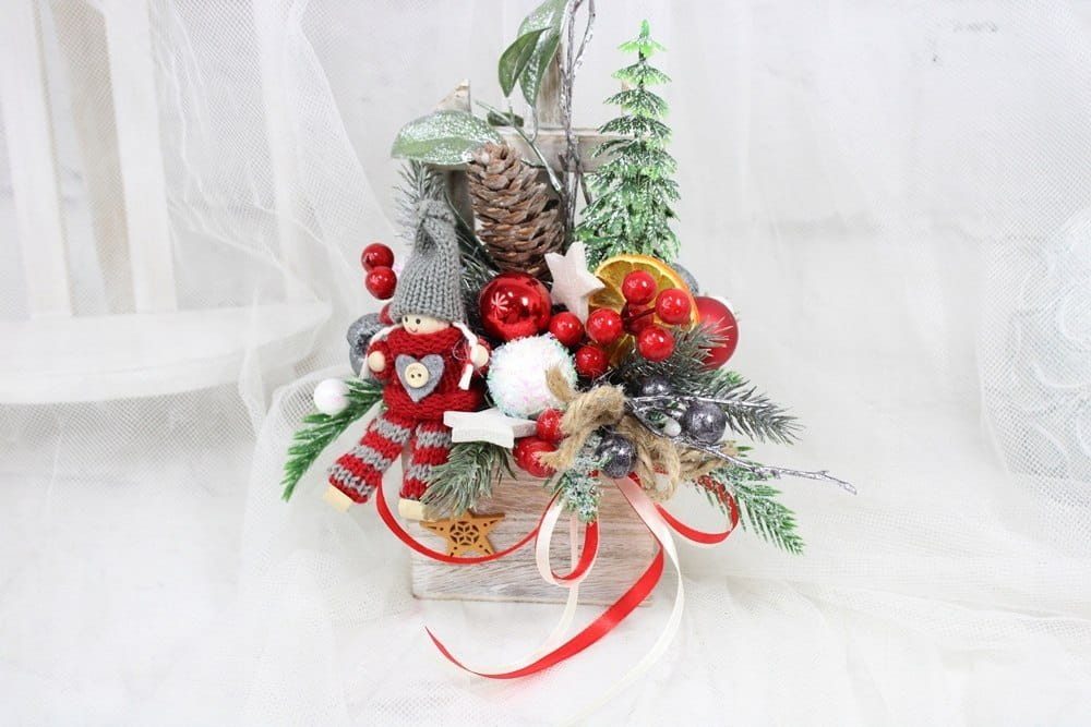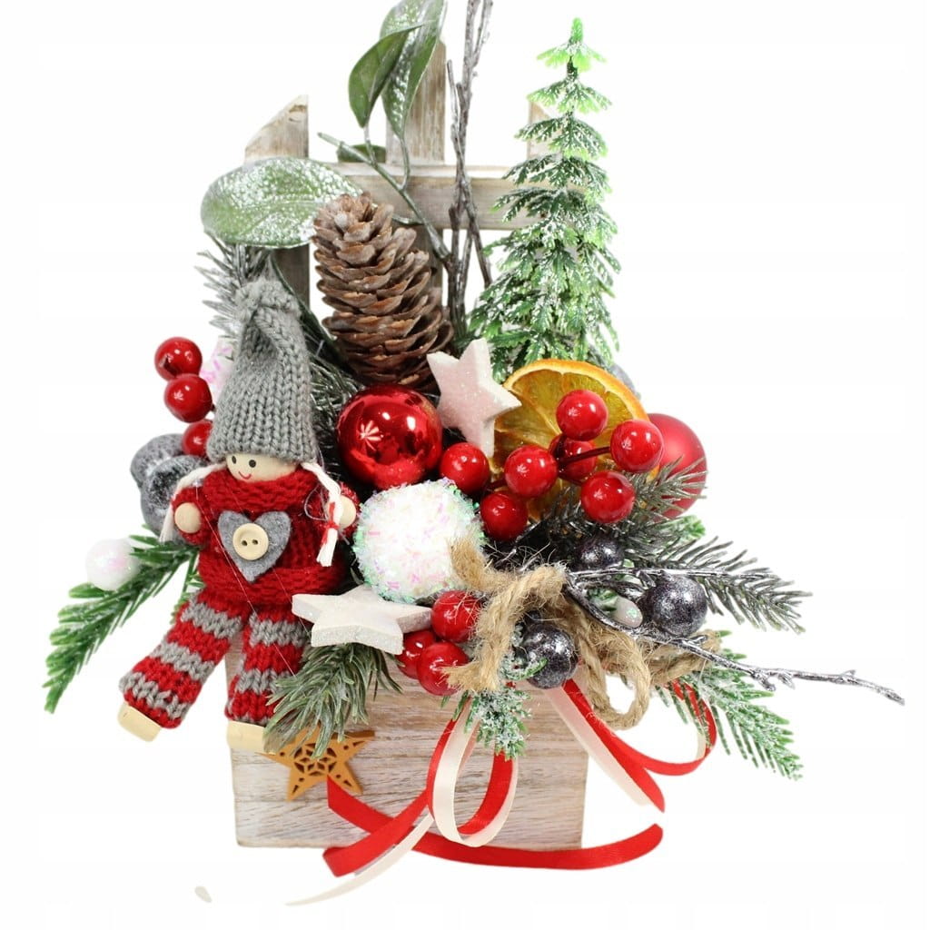 Stylowa dekoracja wprowadzająca do wnętrza ciepły, magiczny klimat świąt. Ręcznie wykonana z dbałością o detale, ozdobiona naturalnymi elementami, bombkami i subtelnymi akcentami w kolorach świątecznych. Idealna na stół, komodę, parapet.
