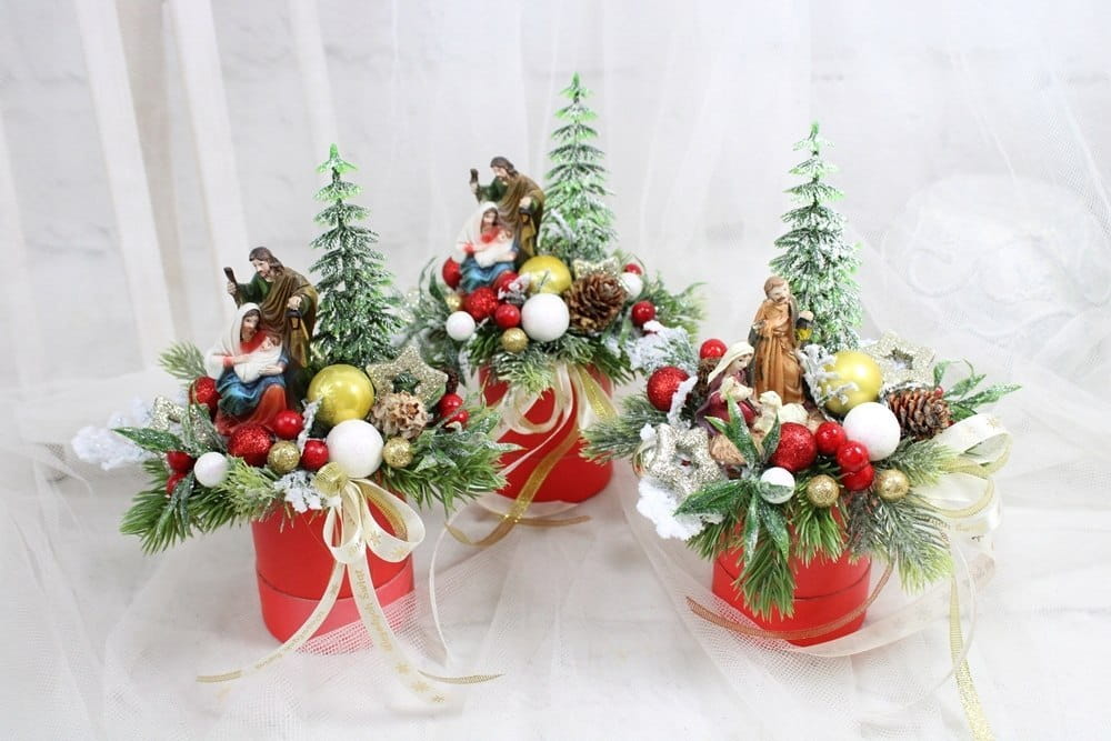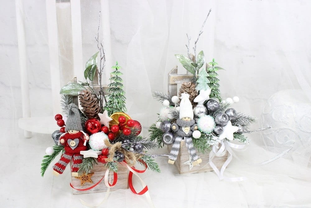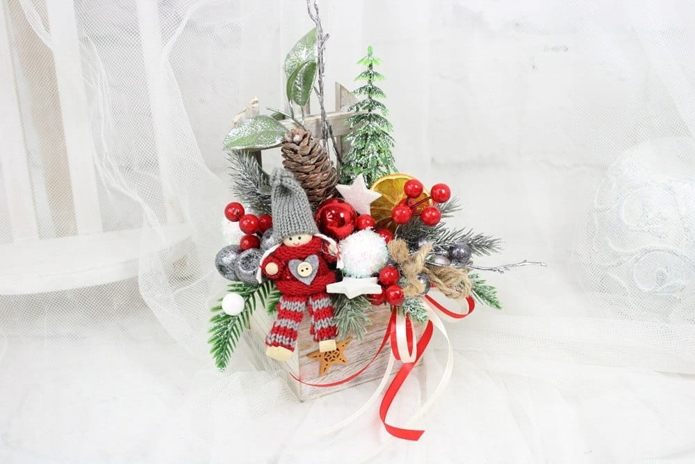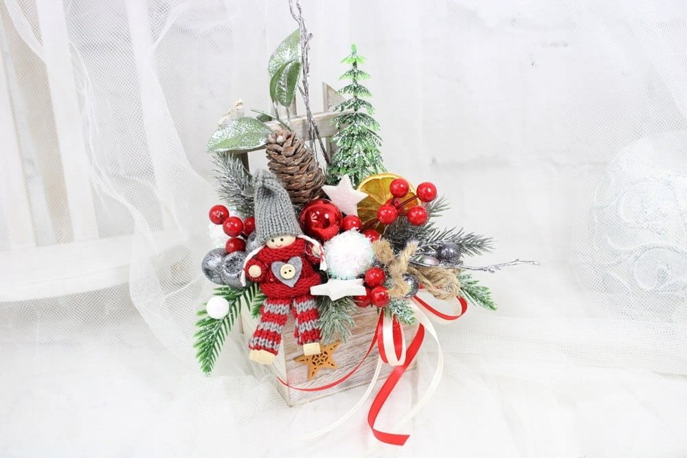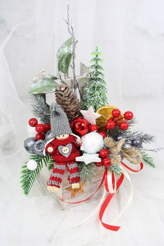 Stylowa dekoracja wprowadzająca do wnętrza ciepły, magiczny klimat świąt. Ręcznie wykonana z dbałością o detale, ozdobiona naturalnymi elementami, bombkami i subtelnymi akcentami w kolorach świątecznych. Idealna na stół, komodę, parapet.