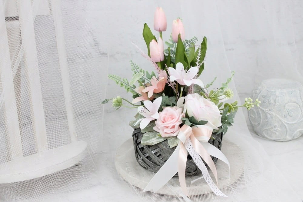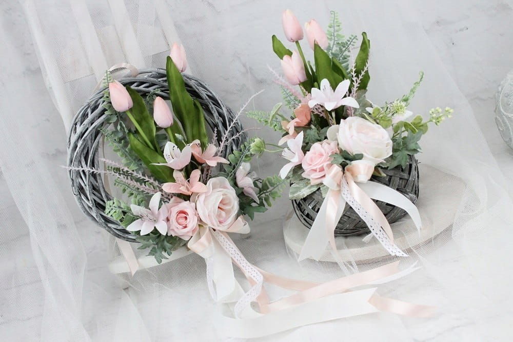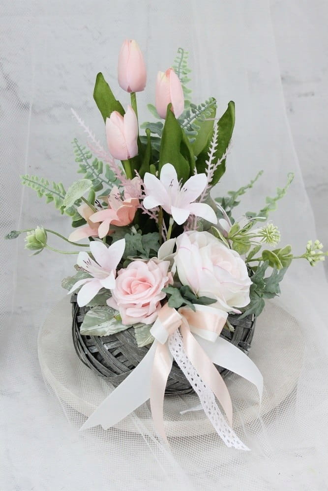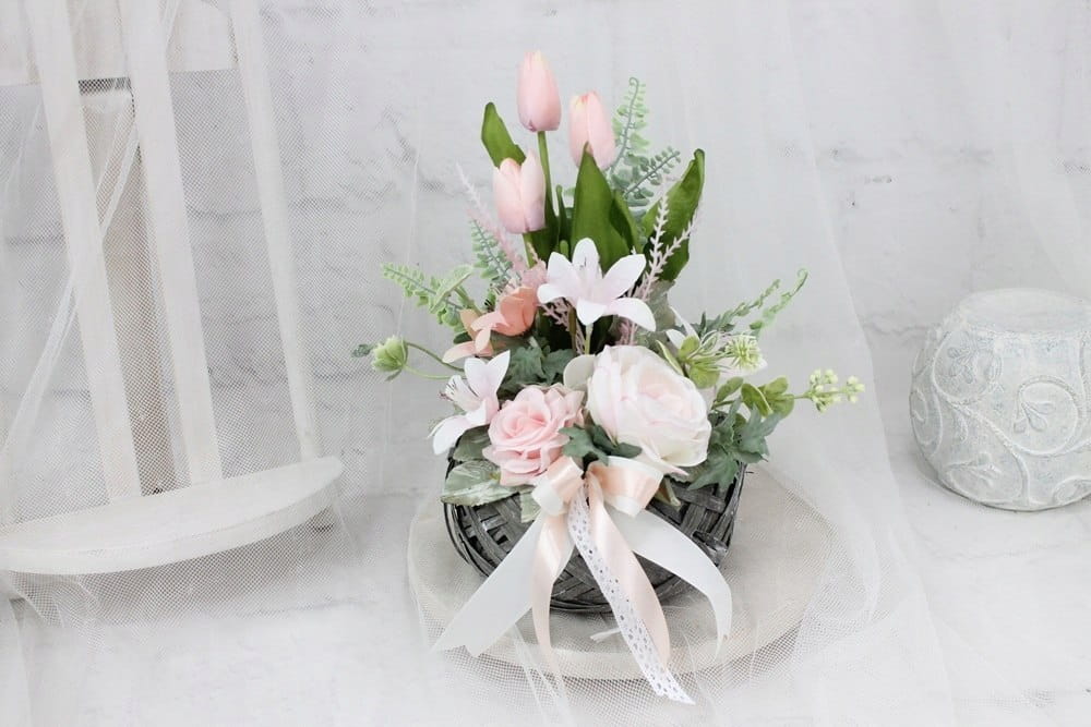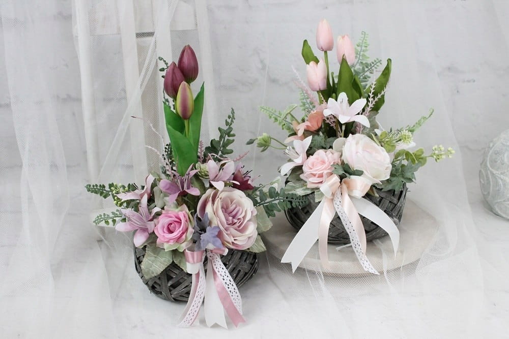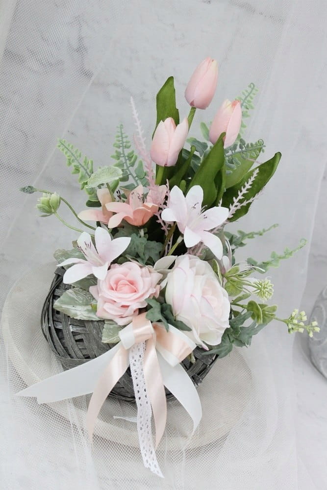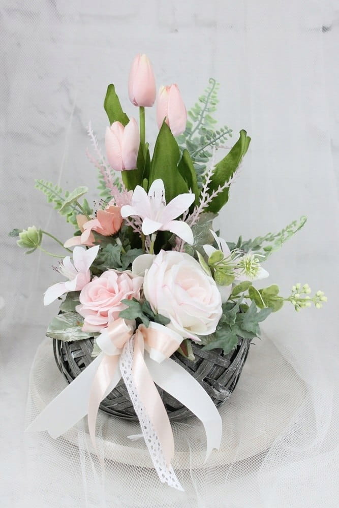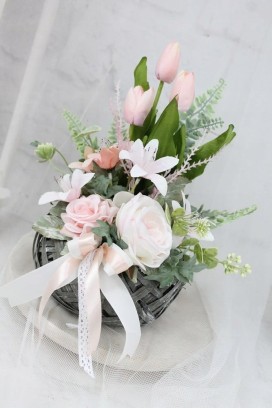 Udekorowana naturalnie wyglądającymi wiosennymi kwiatami tulipanów i innymi kwiatami, gałązkami oraz pięknymi dodatkami, idealnie wpisująca się w obecne trendy.