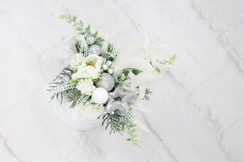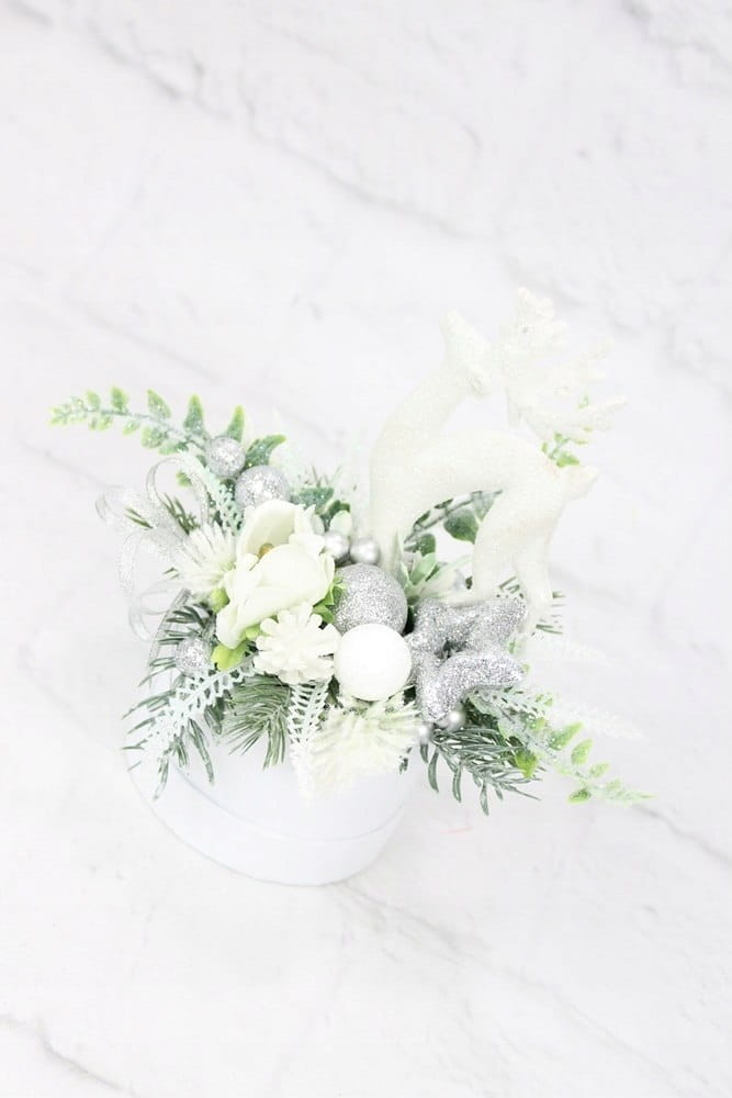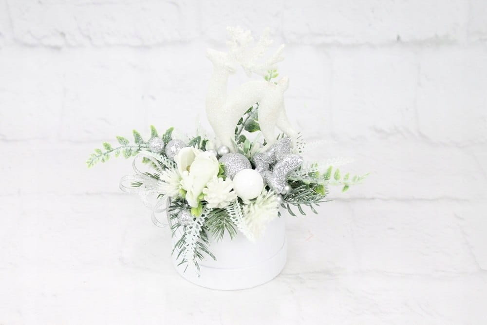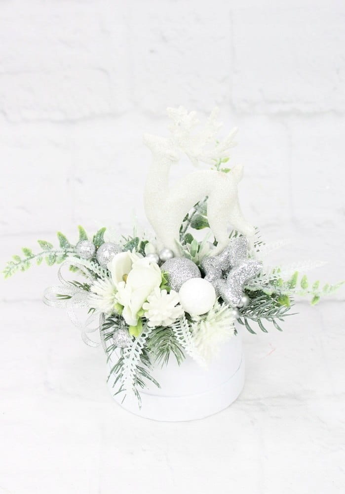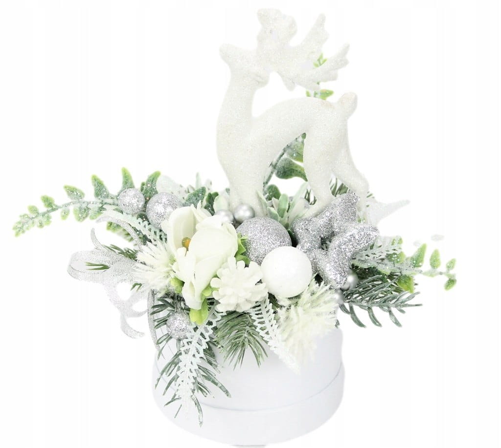 Udekorowany naturalnie wyglądającymi sztucznymi gałązkami oraz pięknymi świątecznymi dodatkami, idealnie wpisująca się w trendy świąteczne. Dodatkowym atutem wyróżniającym kompozycje jest piękny renifer.