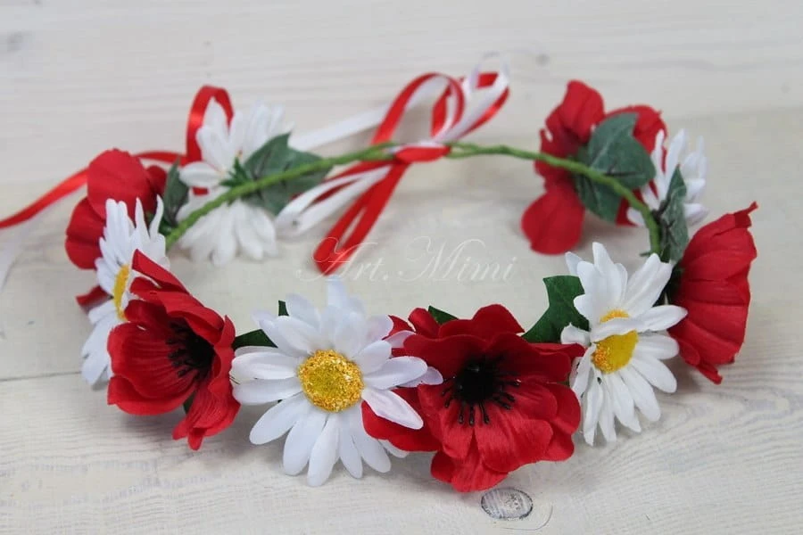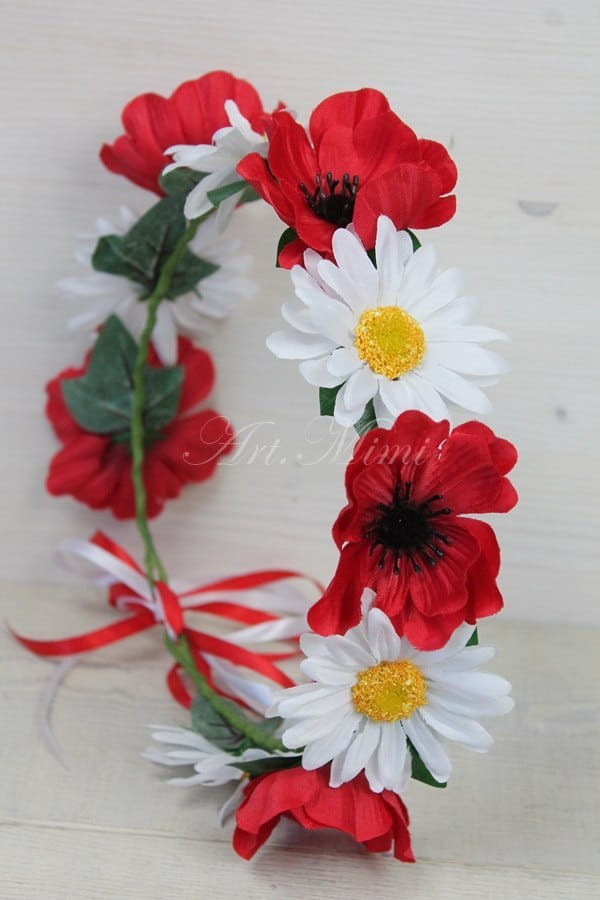 Śliczny wianek, wykonany z maków i margaretek w kolorze biało czerwonym, zdobiony zielonymi listkami bluszczu oraz tasiemką dopasowaną do koloru kwiatów.