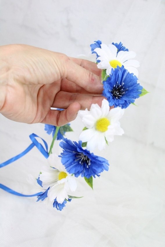 Uroczy, delikatny i niepowtarzalny wianek krakowski, pełen delikatnych kwiatów chabrów i rumianków, zdobiony zielonymi listkami i satynowymi tasiemkami.