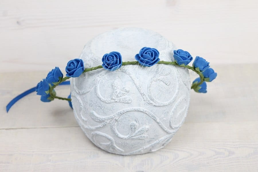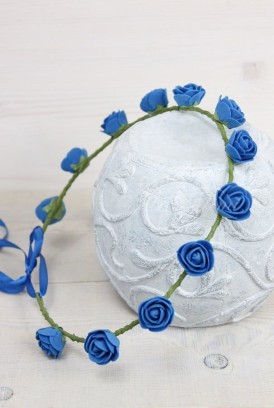 Delikatny i niezwykle romantyczny wianuszek na głowę, zdobiony pastelowymi różyczkami w kolorze GRANATOWYM oraz tasiemką dopasowaną do koloru róż.