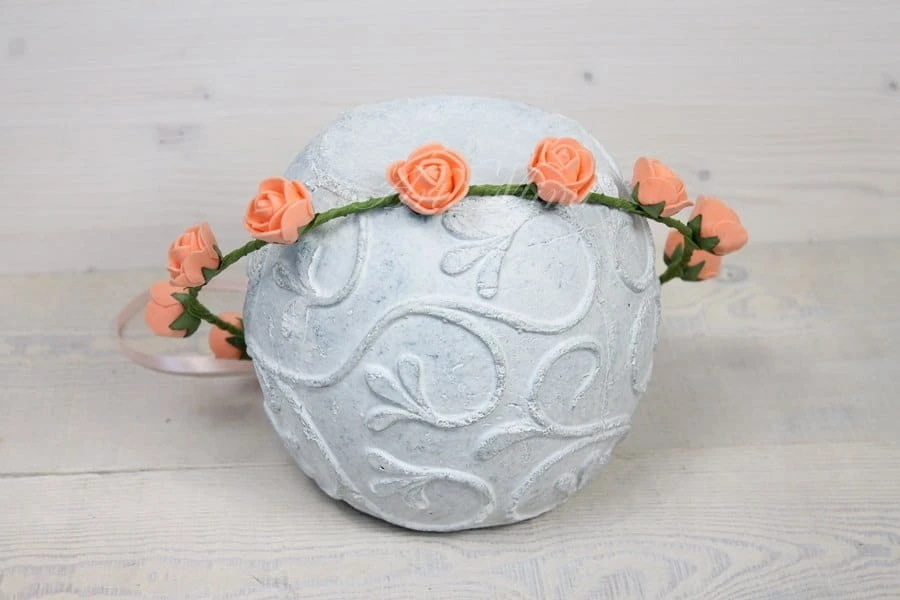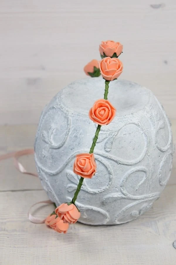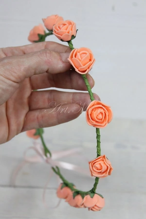 Delikatny i niezwykle romantyczny wianuszek na głowę, zdobiony pastelowymi różyczkami w kolorze morelowym oraz tasiemką dopasowaną do koloru róż.