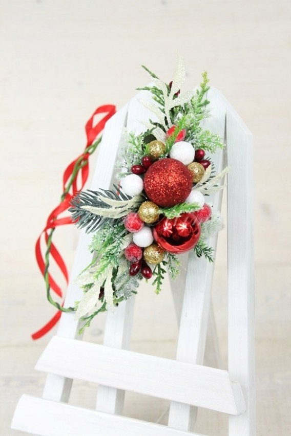 Wykonany w tonacji czerwonej, zdobiony świątecznymi iglastymi gałązkami dekoracyjnymi liśćmi, bombkami, jarzębiną i brokatowymi gałązkami.