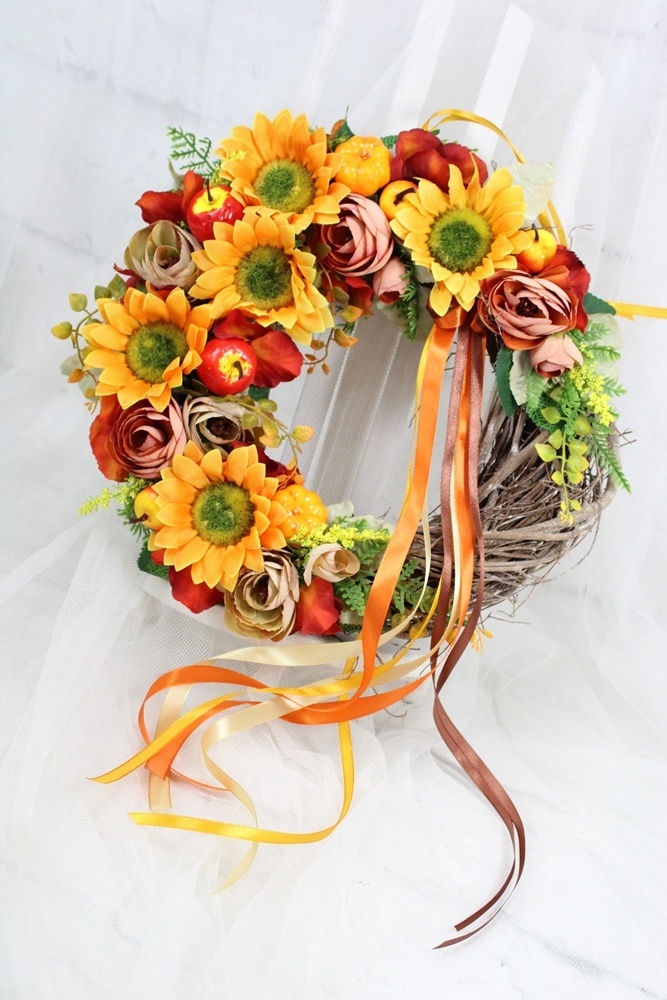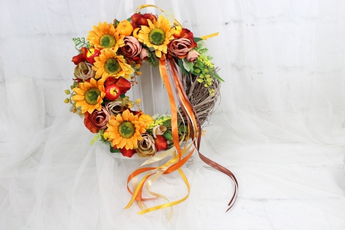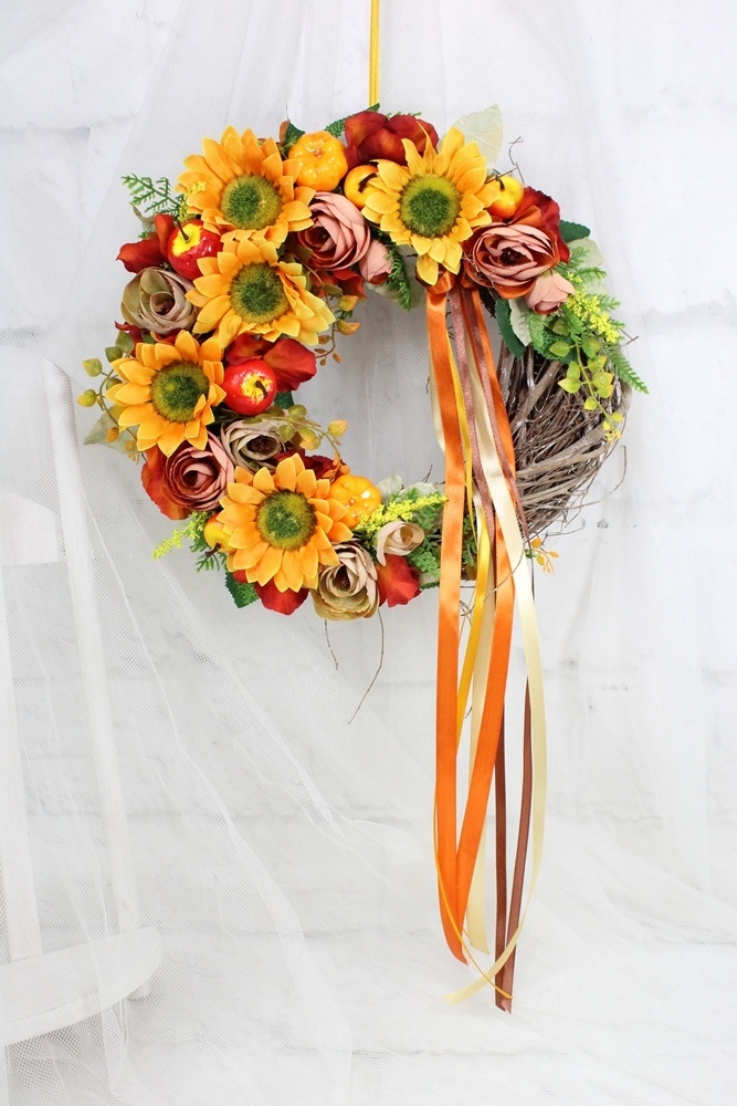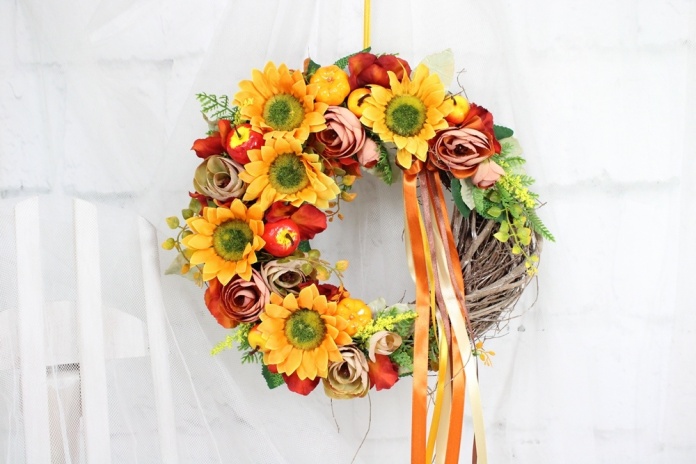 Jesienny wianek wyplatany o średnicy 30cm udekorowany jesiennymi kwiatami słonecznika, róż i pełnika.