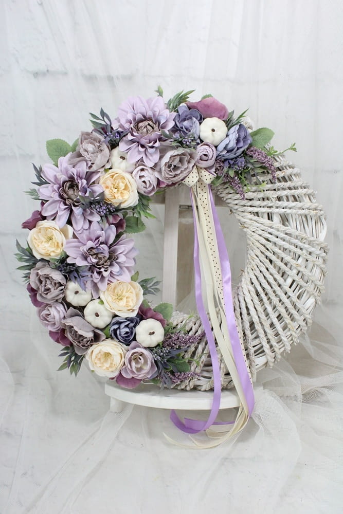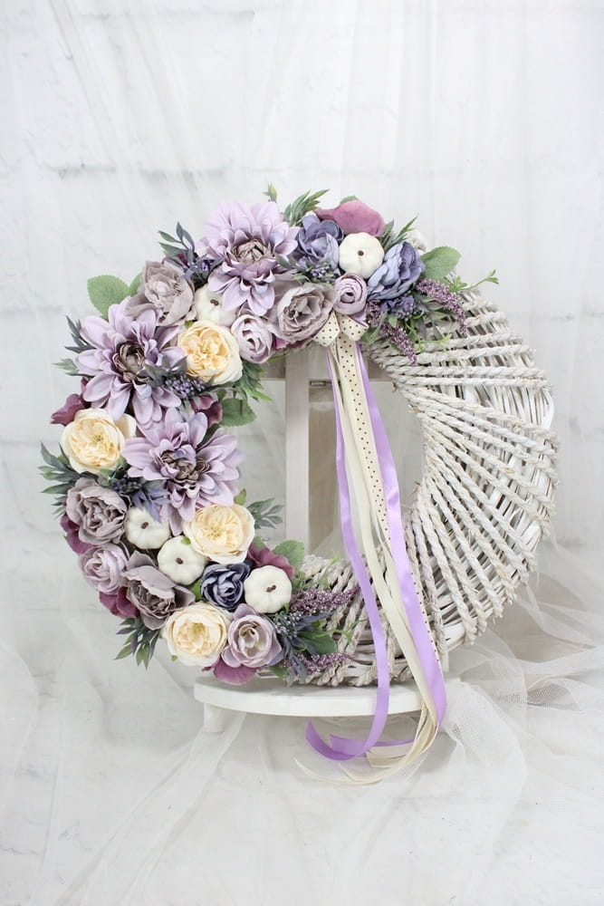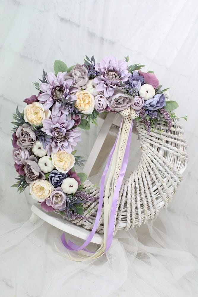 Jesienny, niepowtarzalny wianek wiklinowy oplatany sznurkiem o średnicy 40cm udekorowany jesiennymi kwiatami i pąkami anemonów, pełnika, peoni i róż