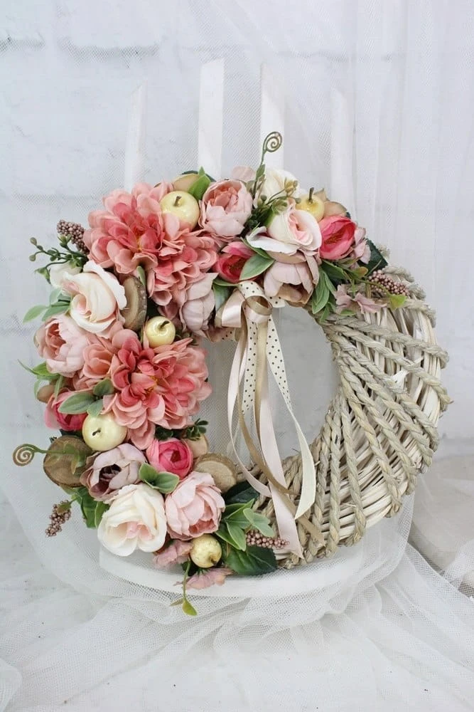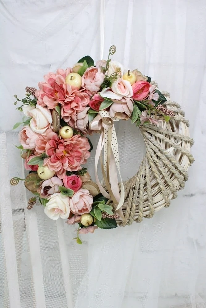 Jesienny piękny wianek wiklinowy oplatany sznurkiem o średnicy 35cm udekorowany jesiennymi kwiatami dali, anemonów, róż i peoni.
