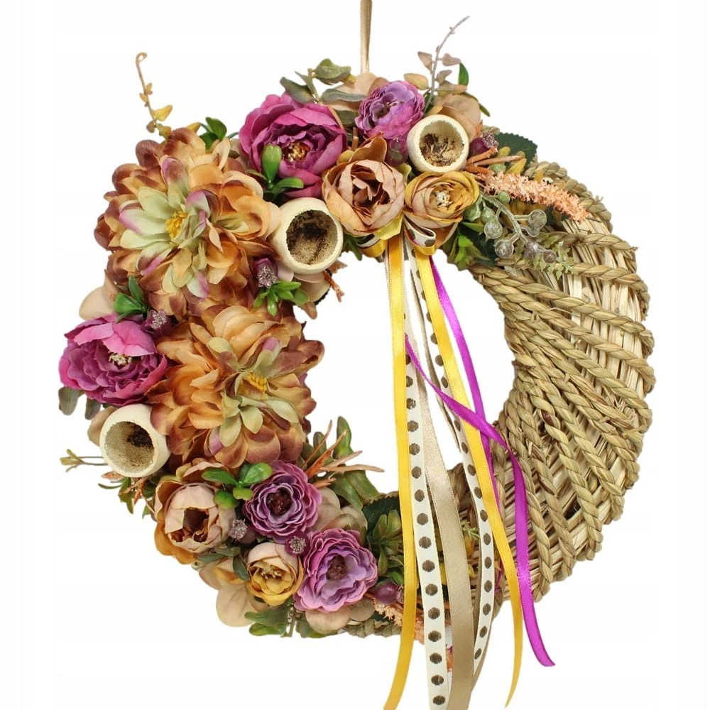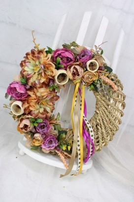 Jesienny piękny wianek wiklinowy oplatany sznurkiem o średnicy 35cm udekorowany jesiennymi kwiatami dali, anemonów, róż i peoni.