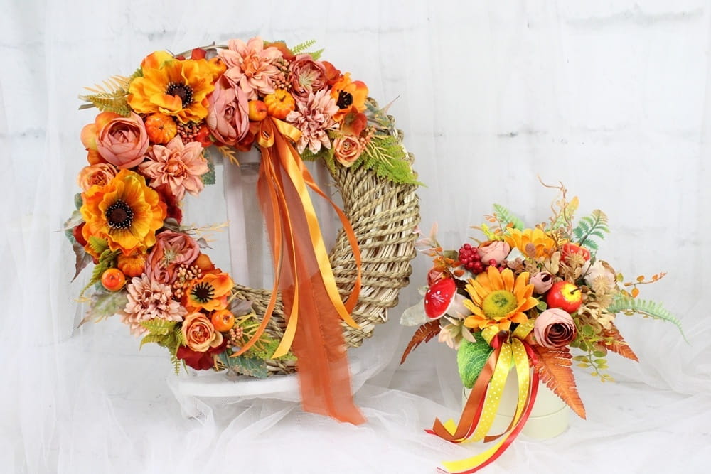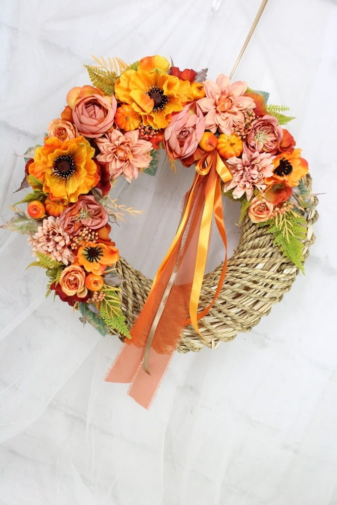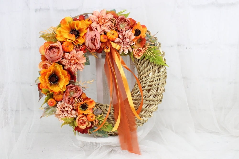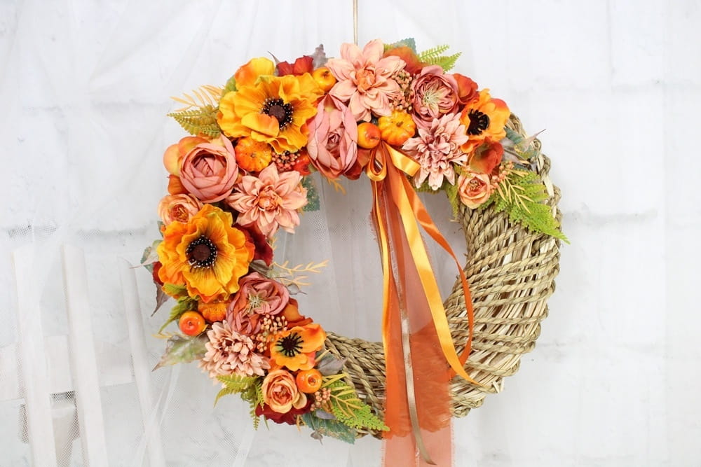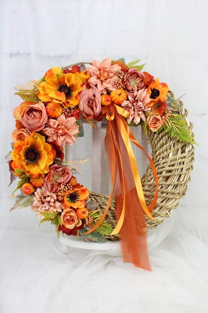 Jesienny, niepowtarzalny wianek wiklinowy oplatany sznurkiem o średnicy 40cm udekorowany jesiennymi kwiatami i pąkami maków, anemonów, pełnika, peoni i róż