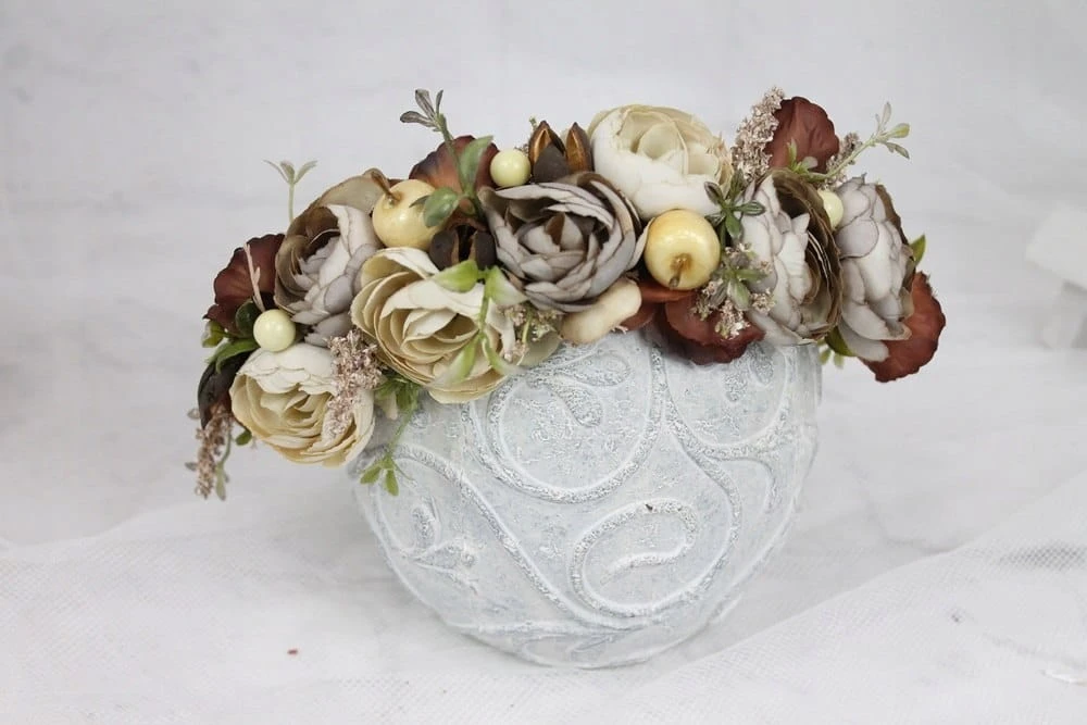 Efektowny i niepowtarzalny wianek upleciony z kwiatów i pąków jesiennych kwiatów, zdobiony listkami bluszczu, paproci, dekoracyjnych traw oraz owocami jabłek i jarzębiny.