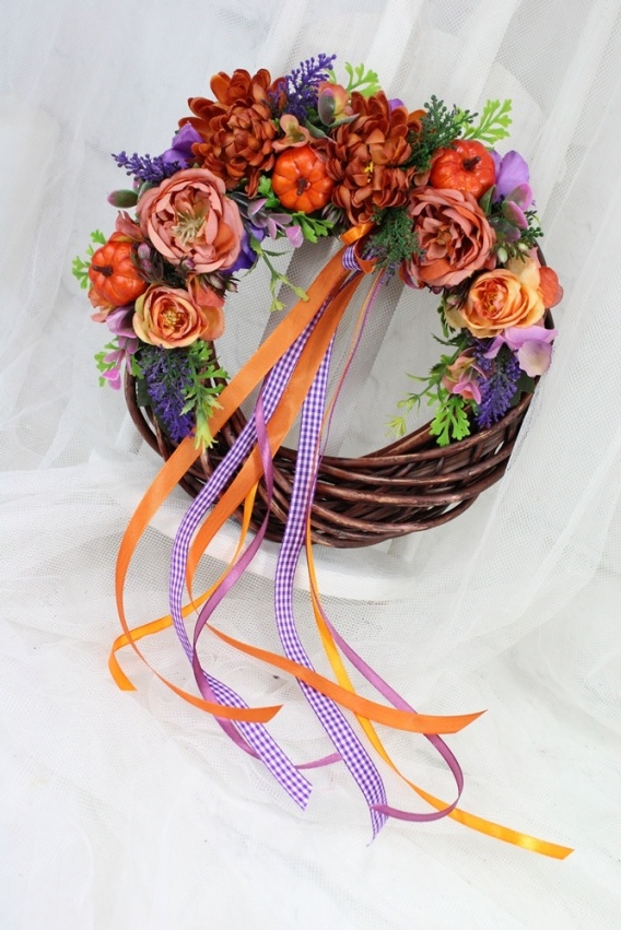 Dodatkowo zdobiony liśćmi, dekoracyjną trawą oraz tasiemką dopasowaną kolorystycznie. Niezwykłego uroku dodają mu również piękne dynie oraz kaskadowo spływające tasiemki..