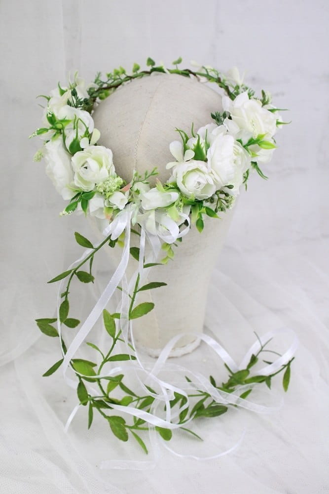 Niezwykłej elegancji dodają wiankowi kaskadowo spływające gałązki i tasiemki.