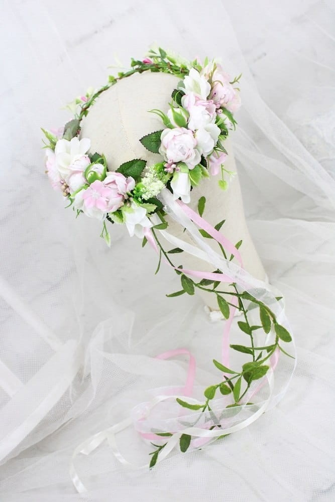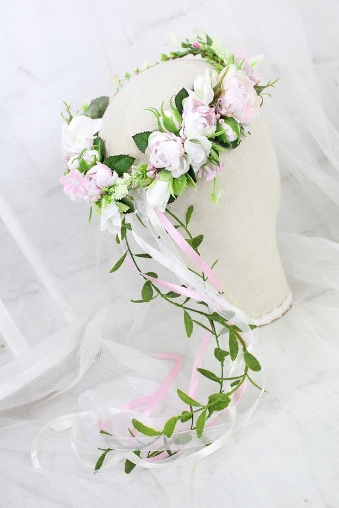 Niezwykłej elegancji dodają wiankowi kaskadowo spływające gałązki i tasiemki.