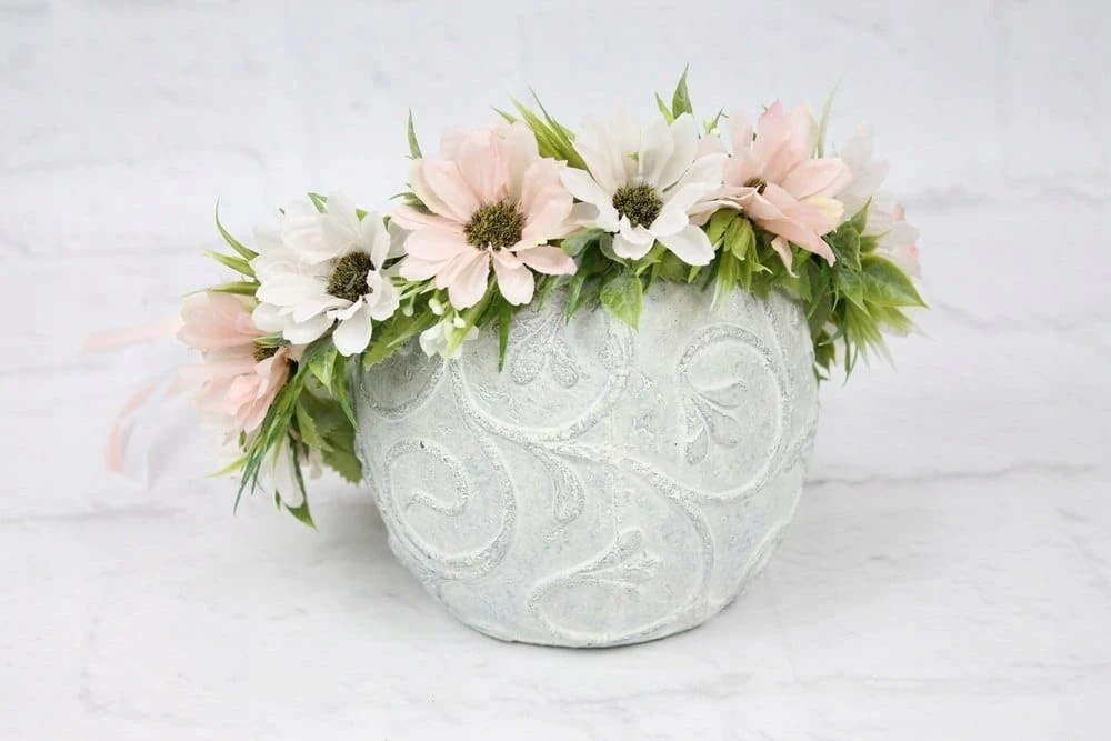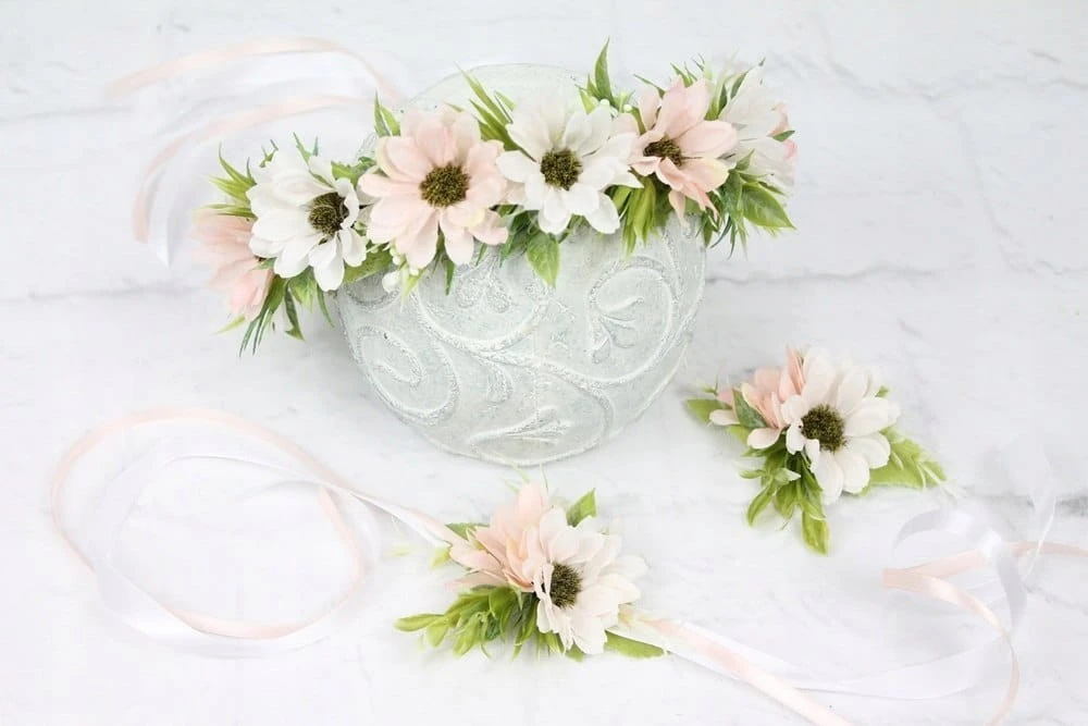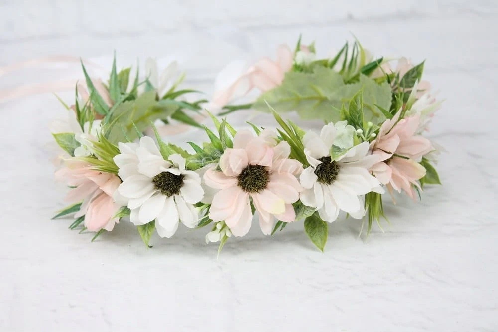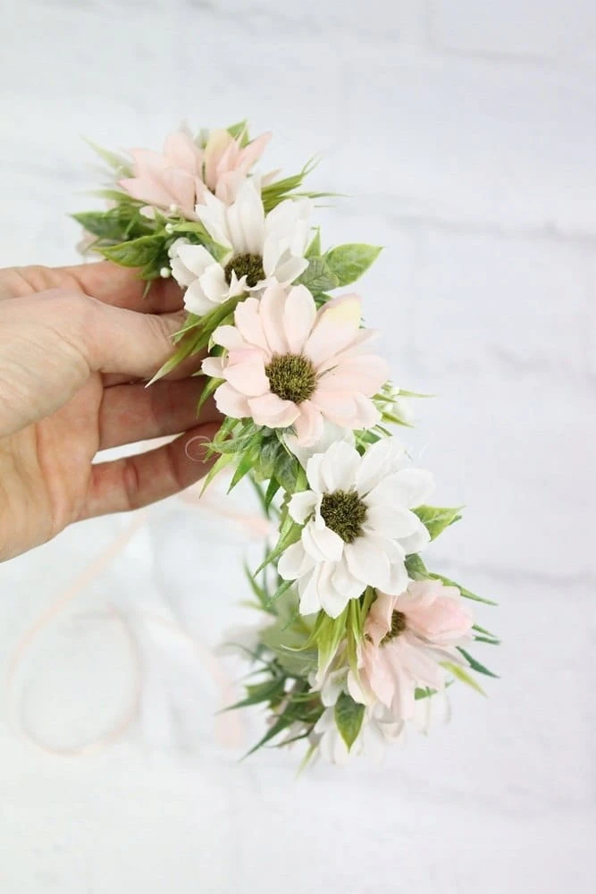 Romantyczny i wyjątkowy wianek komunijny, wykonany z kwiatów rumianku w odcieniach pudrowego różu, z dodatkiem stylowych dekoracyjnych traw, idealnie wpisujących się w obecne trendy.