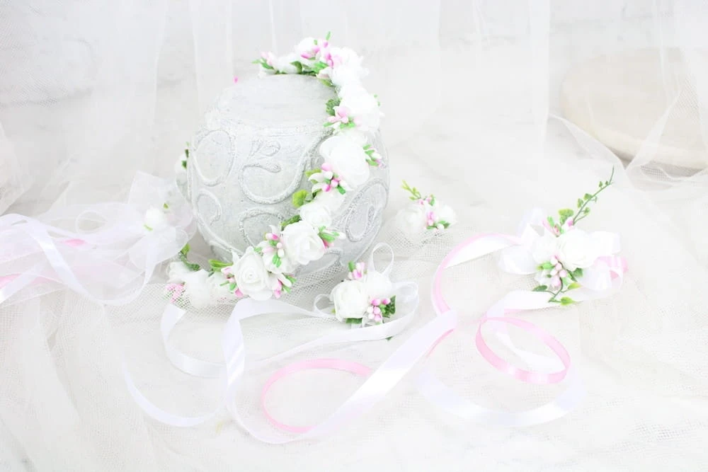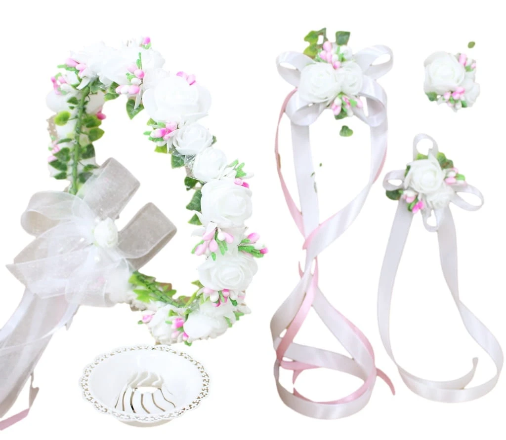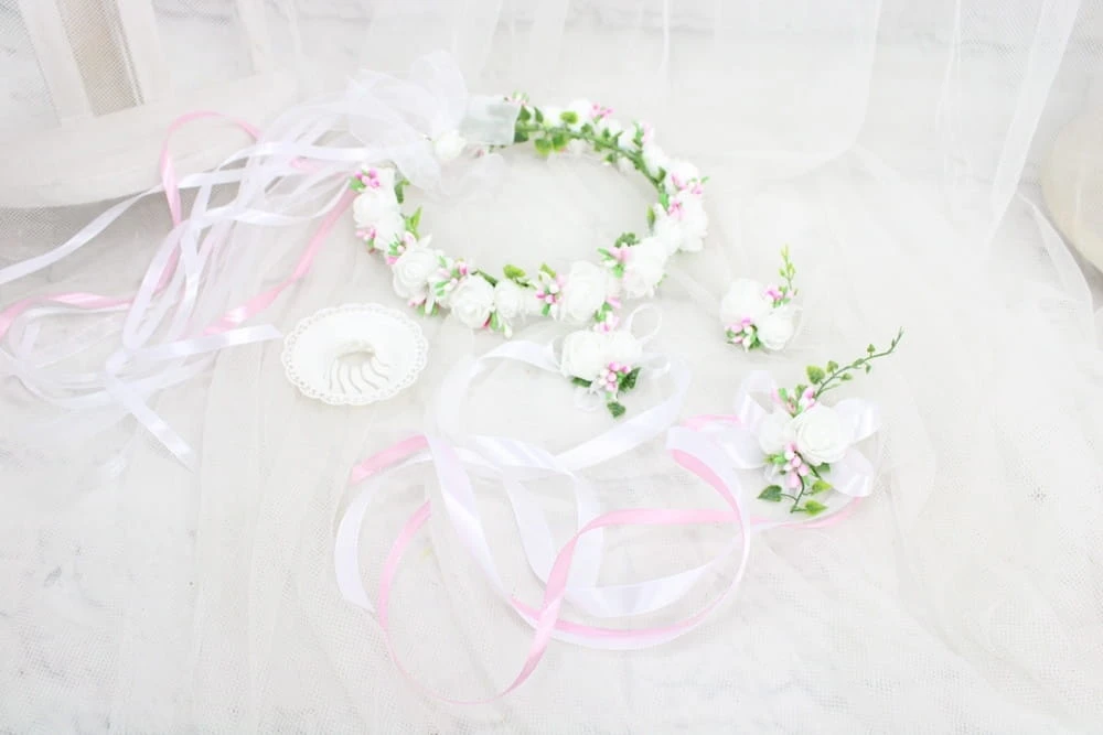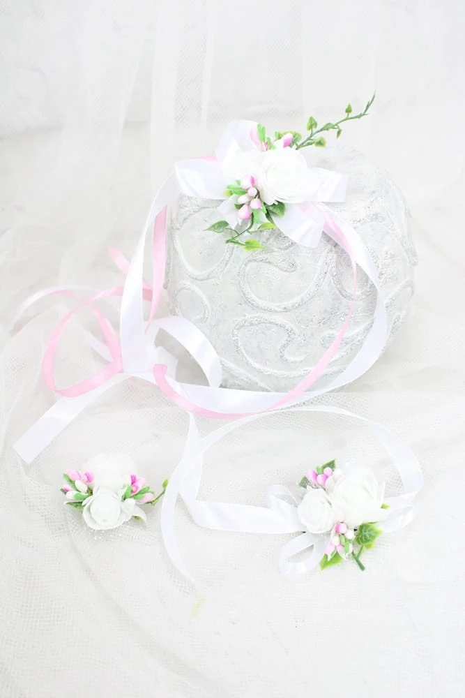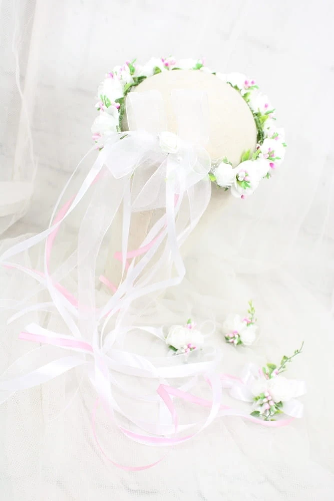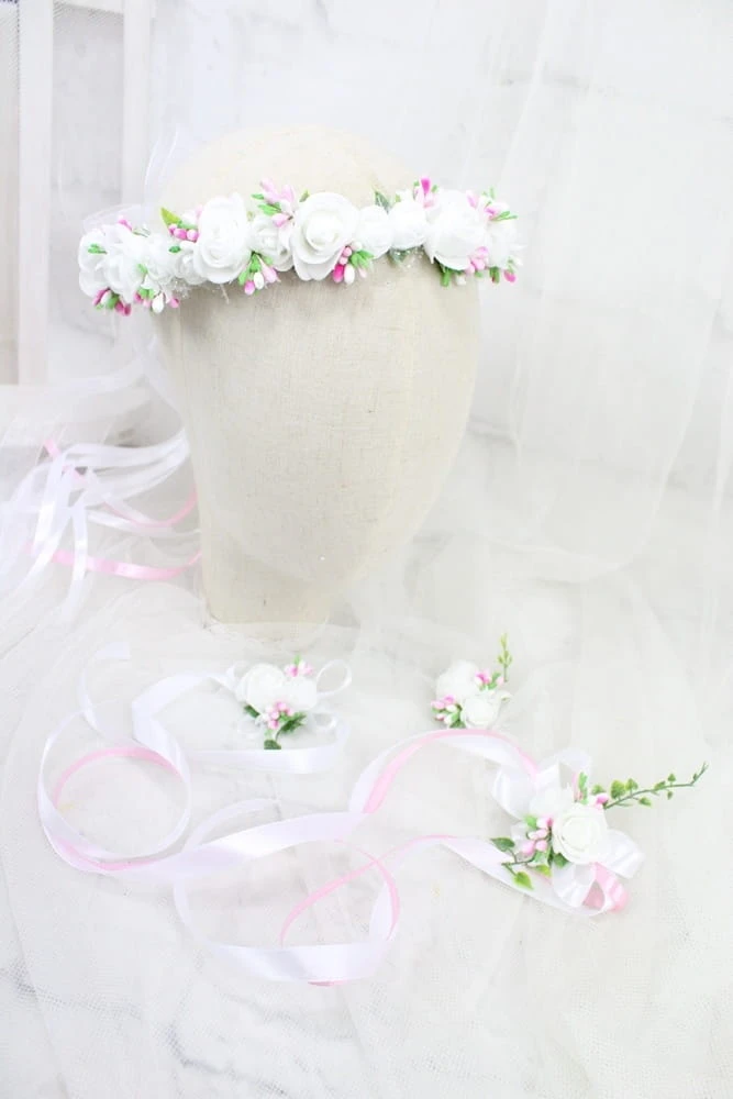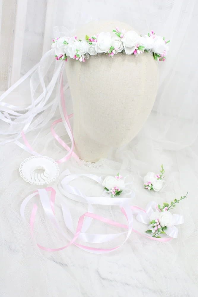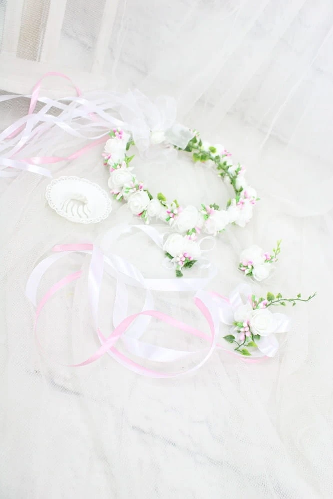 Wianek z piękną kokardą, bukiecik na rękę, ozdoba na świecę oraz stroik na torebkę pełen białych różyczek, zdobiony listkami bluszczu które swoim kształtem przypominają serduszka, pręcikami perłowych perełek oraz dekoracyjną trawą.