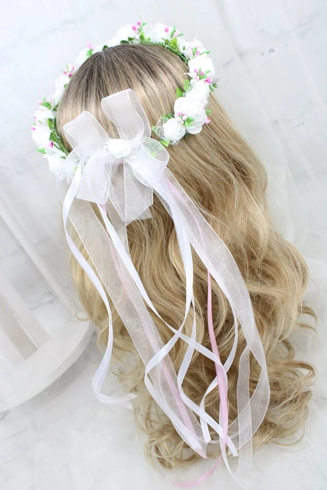 Dodatkowo tył wianuszka posiada odczepianą szyfonową kokardkę z różyczka zamocowaną na grzebyku.