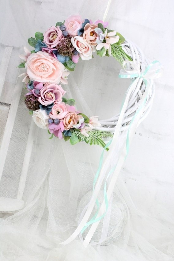 • Wianek kwiatowy dekoracja domu drzwi stroik Pudrowy