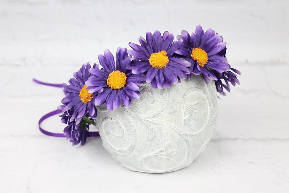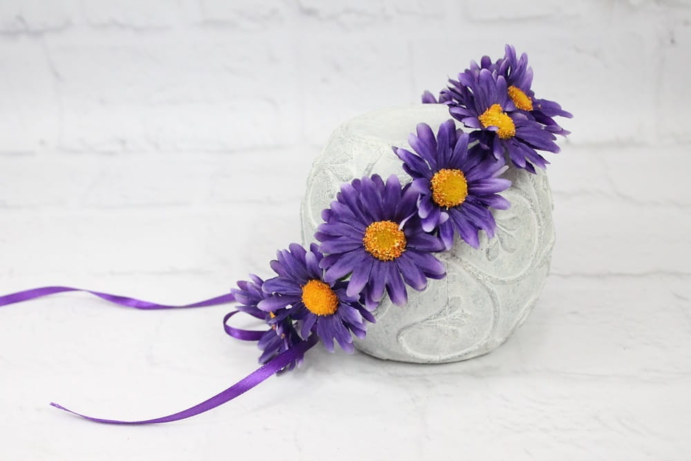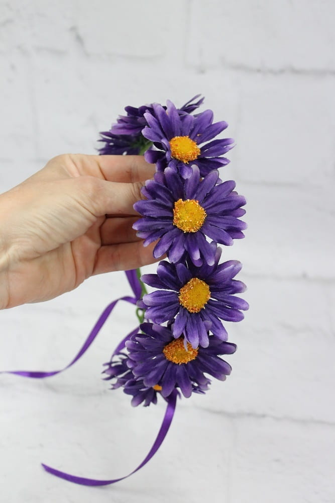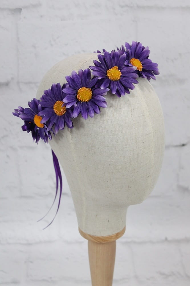 Śliczny i delikatny wianek w stylu boho wykonany z kwiatów margaretki w kolorze satynowe purpury zdobiony tasiemką.