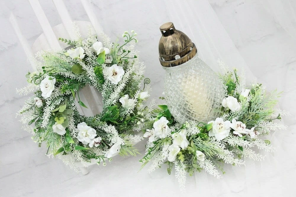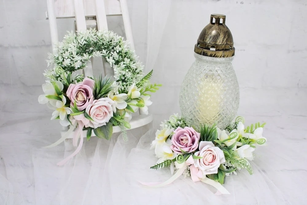 Piękny i oryginalny wianek nagrobny. Idealnie sprawdzi się jako ozdoba pod znicz.