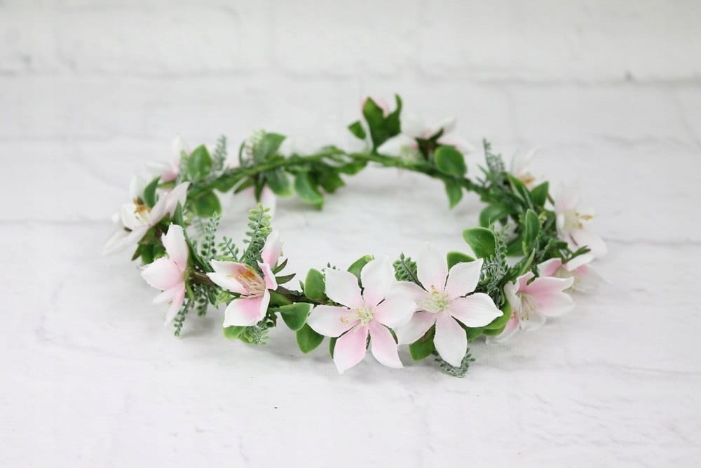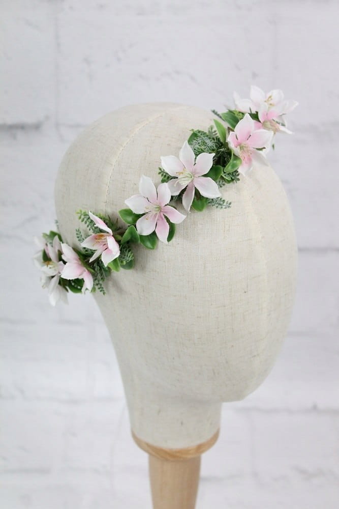 Stylowy i delikatny wianek ślubny upleciony z kwiatów jaśminu w odcieniu kremu i różu z dodatkiem zielonych listków i paproci.