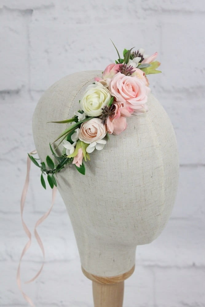 Stylowy i efektowny pół wianek ślubny upleciony z kwiatów i pąków róż, peoni i kwiatów wiśni, zdobiony listkami bluszczu, paproci oraz dekoracyjnych traw.