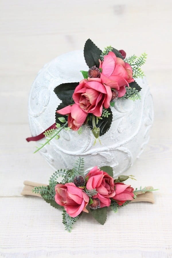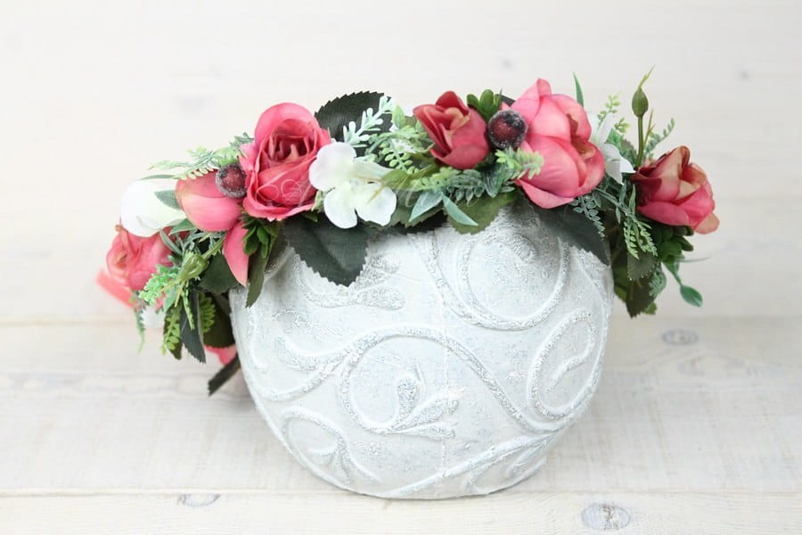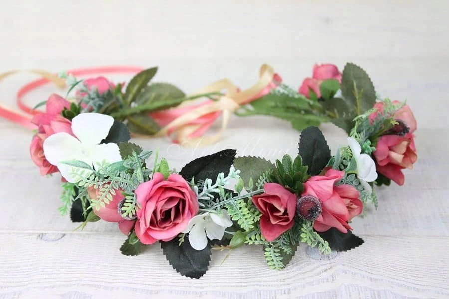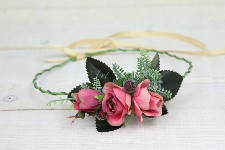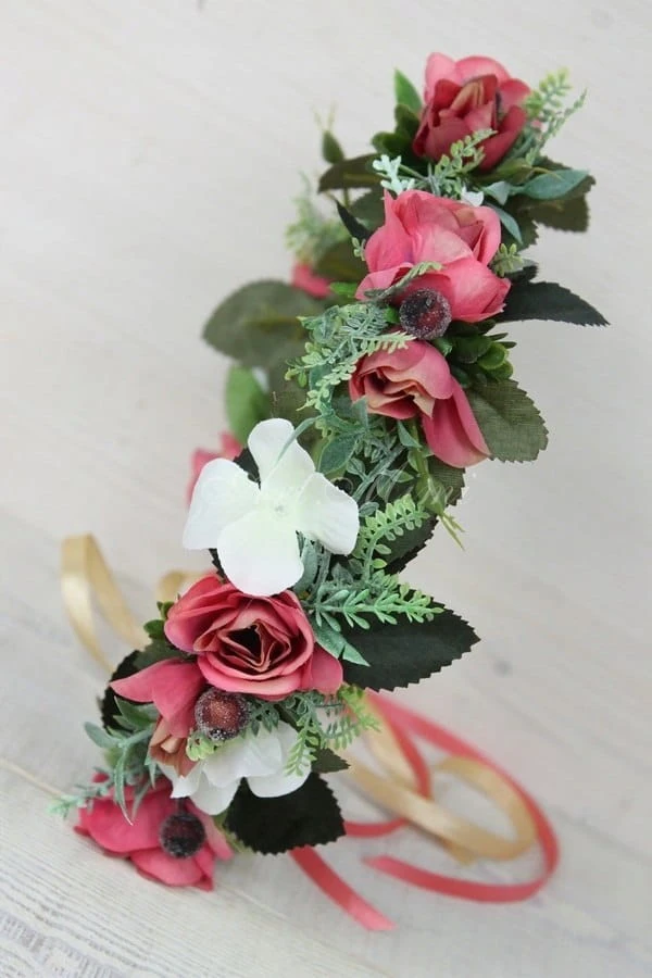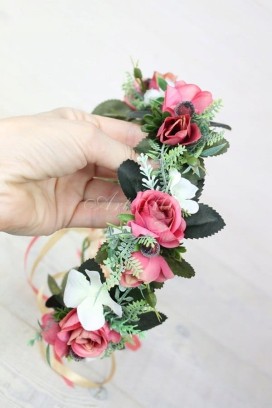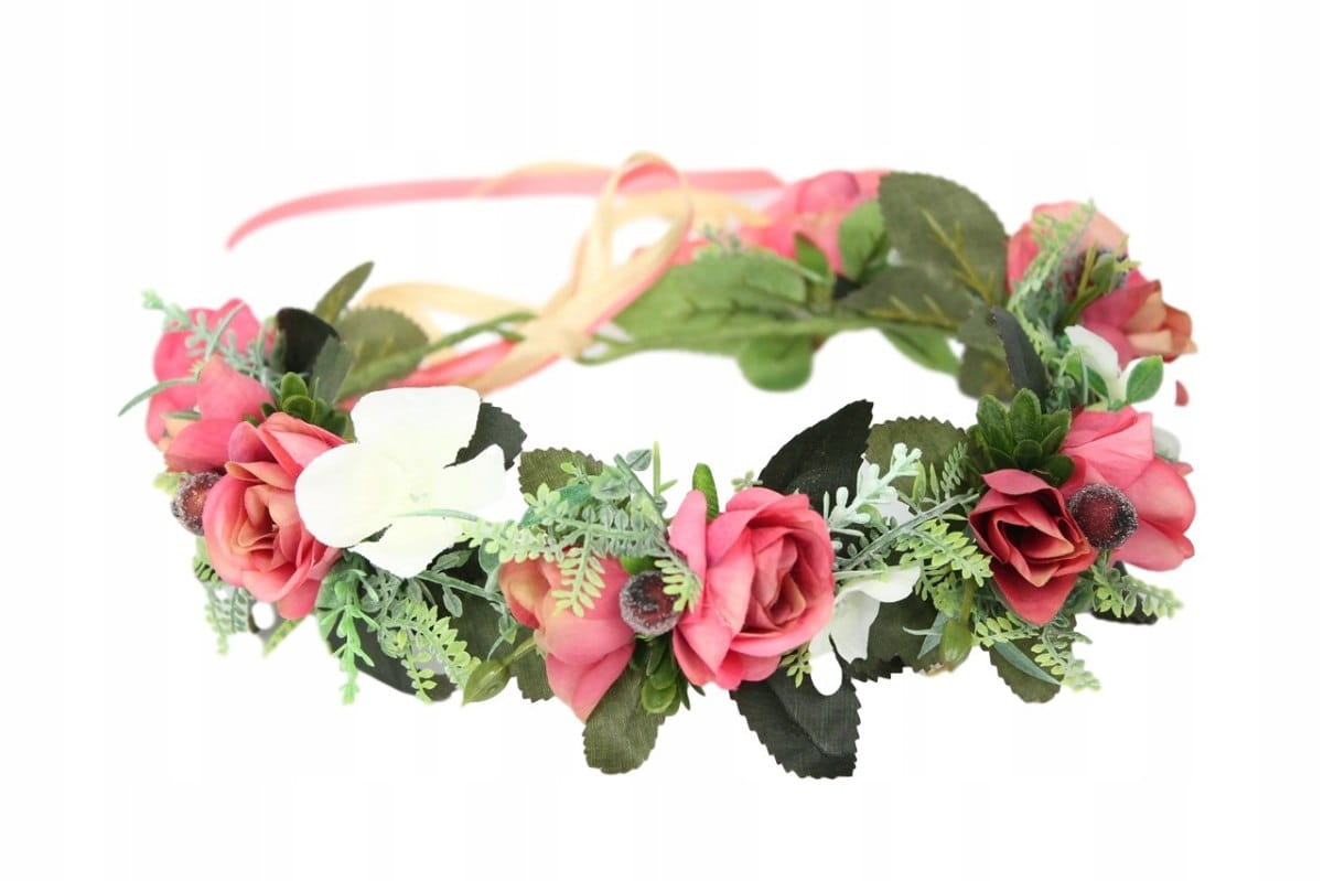 Niepowtarzalny, efektowny a zarazem zwiewny, wianek w stylu boho wykonany z kwiatów i pąków róż w kolorach brudnego różu z bardzo delikatnym odcieniem beżu, zdobiony paprocią, listkami róż, traw, hortensji bukietowej, chmielu oraz jarzębiny z tasiemką dopasowaną do koloru róż.