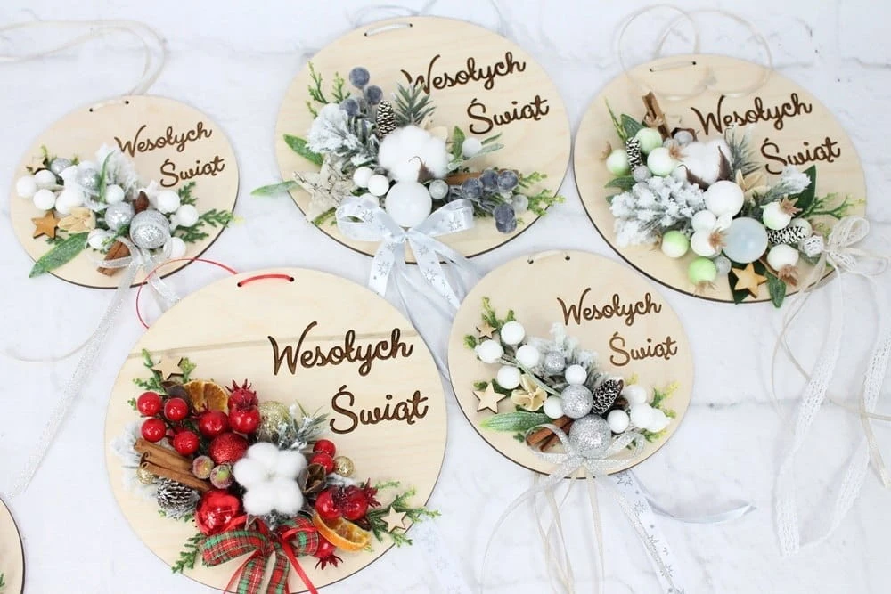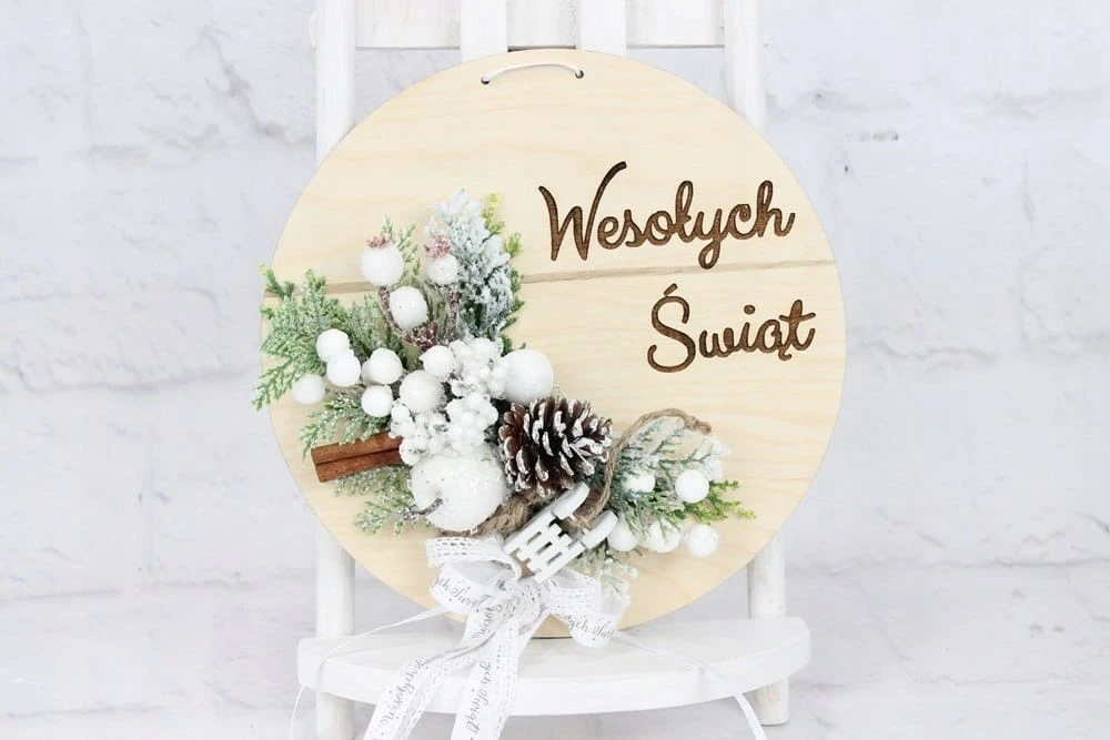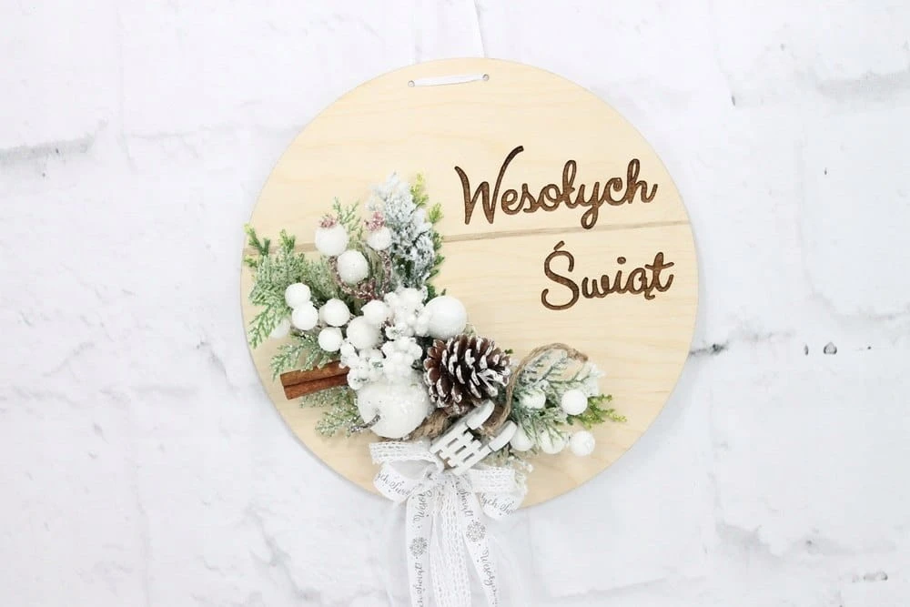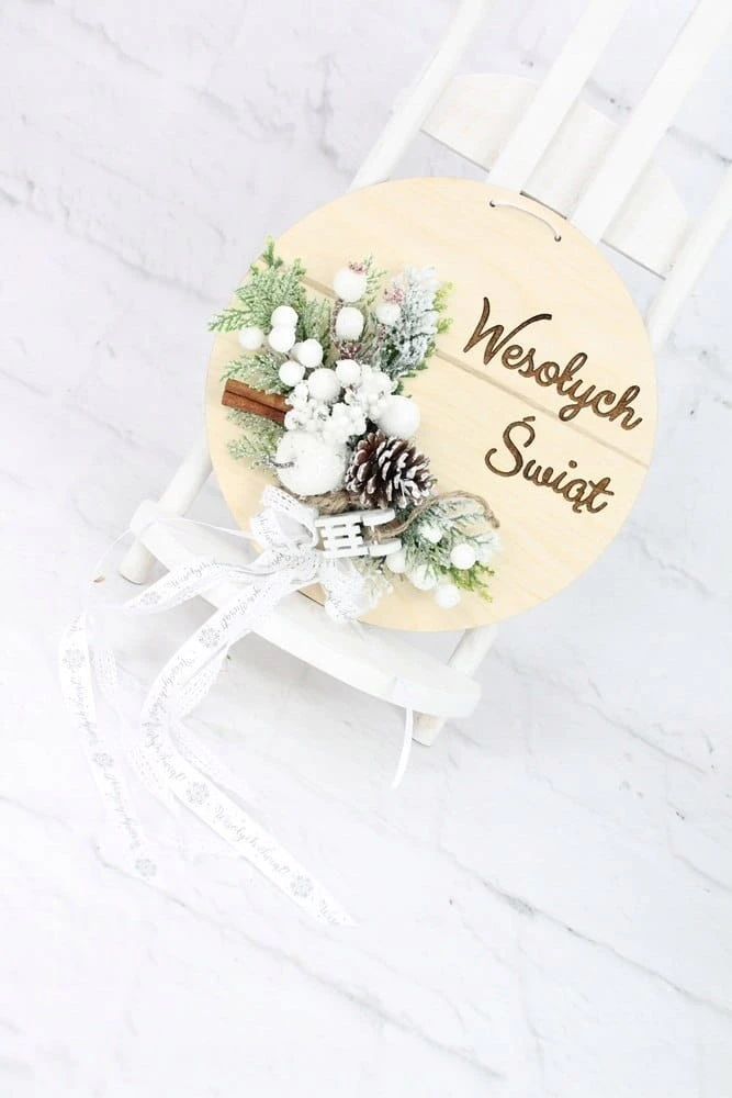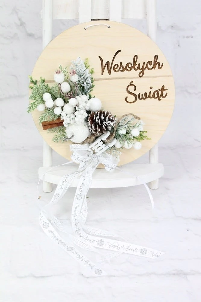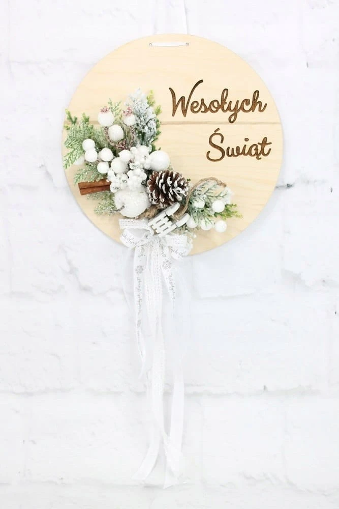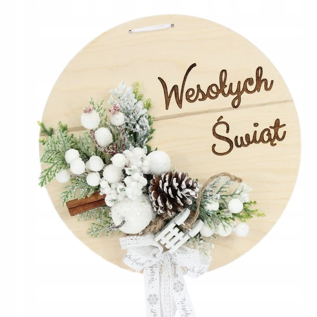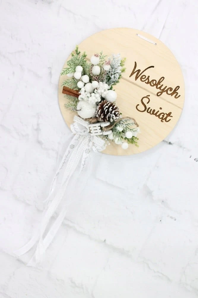 Piękna i niepowtarzalna dekoracja świąteczna w naturalnym stylu wykonana na drewnie w formie koła o średnicy 25cm z napisem Wesołych Świąt.