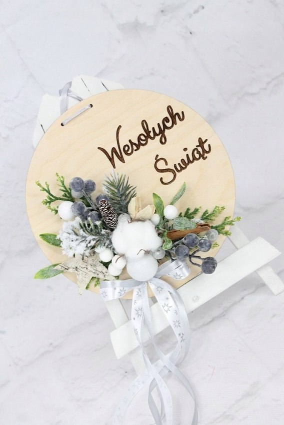 Piękna i niepowtarzalna dekoracja świąteczna w naturalnym stylu wykonana na drewnie w formie koła o średnicy 20cm z napisem Wesołych Świąt.