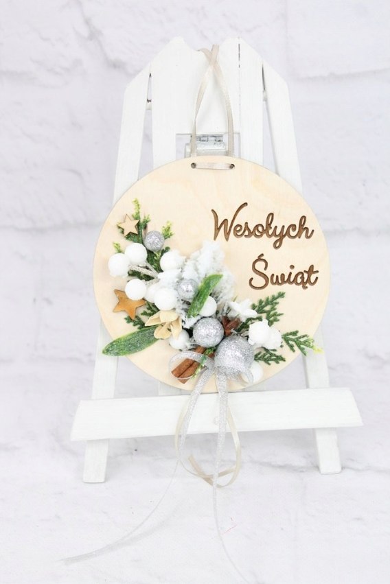 Piękna i niepowtarzalna dekoracja świąteczna w naturalnym stylu wykonana na drewnie w formie koła o średnicy 15cm z napisem Wesołych Świąt.