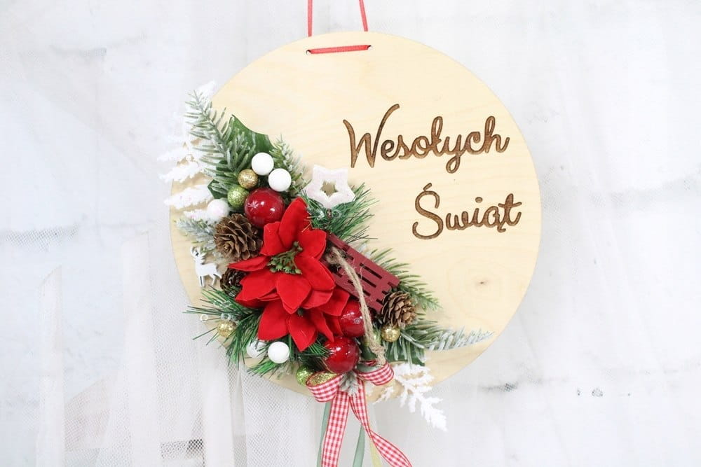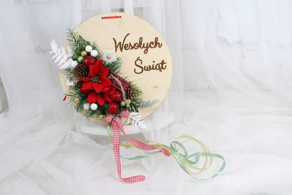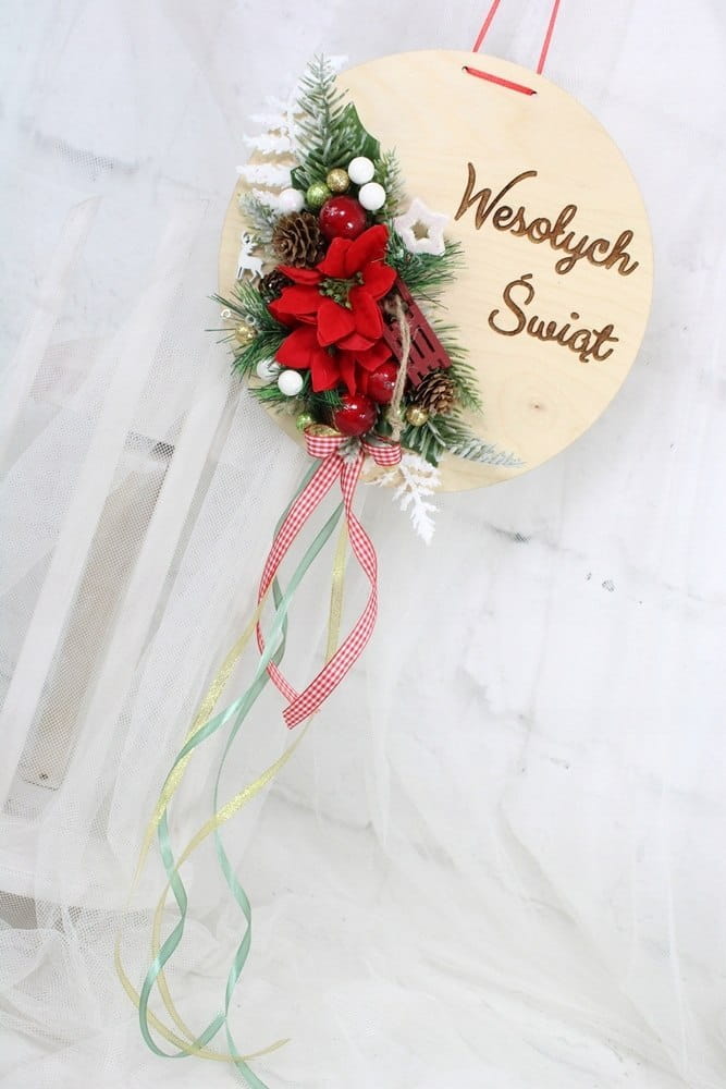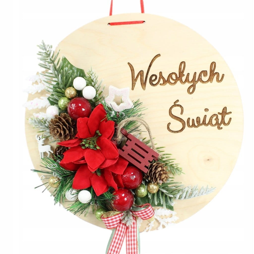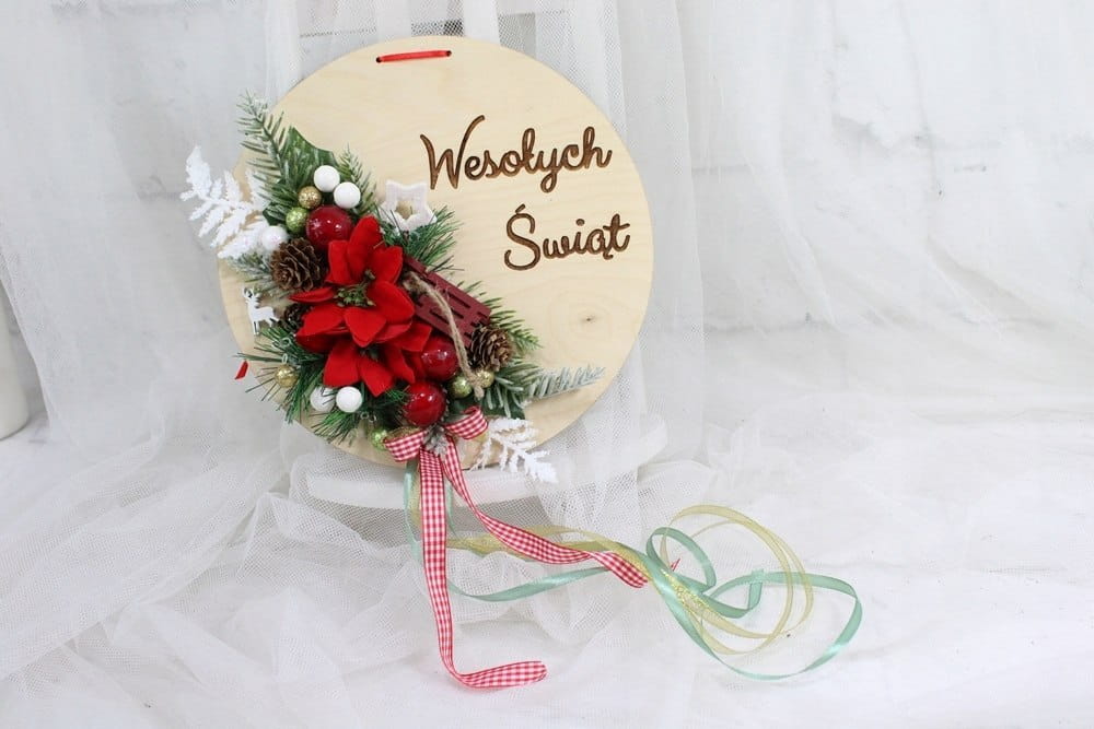 Piękna i niepowtarzalna dekoracja świąteczna w naturalnym stylu wykonana na drewnie w formie koła z napisem Wesołych Świąt.
