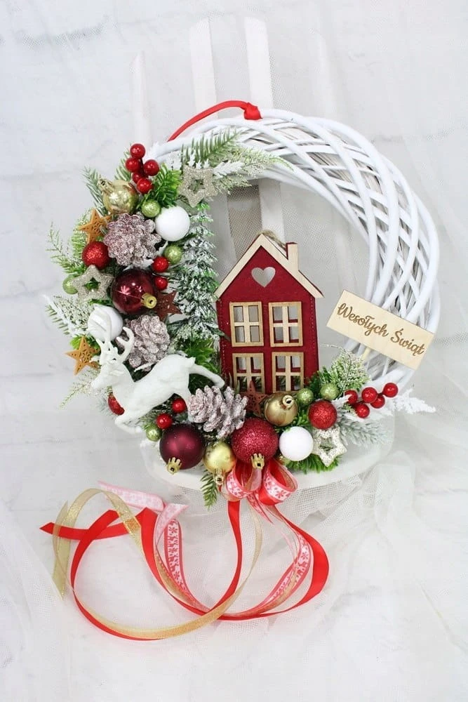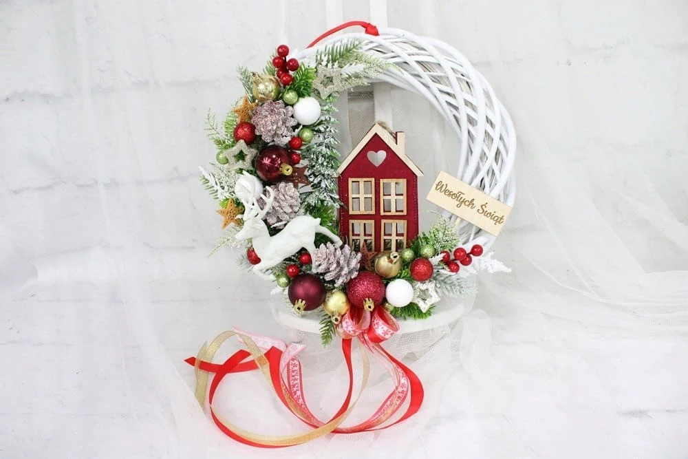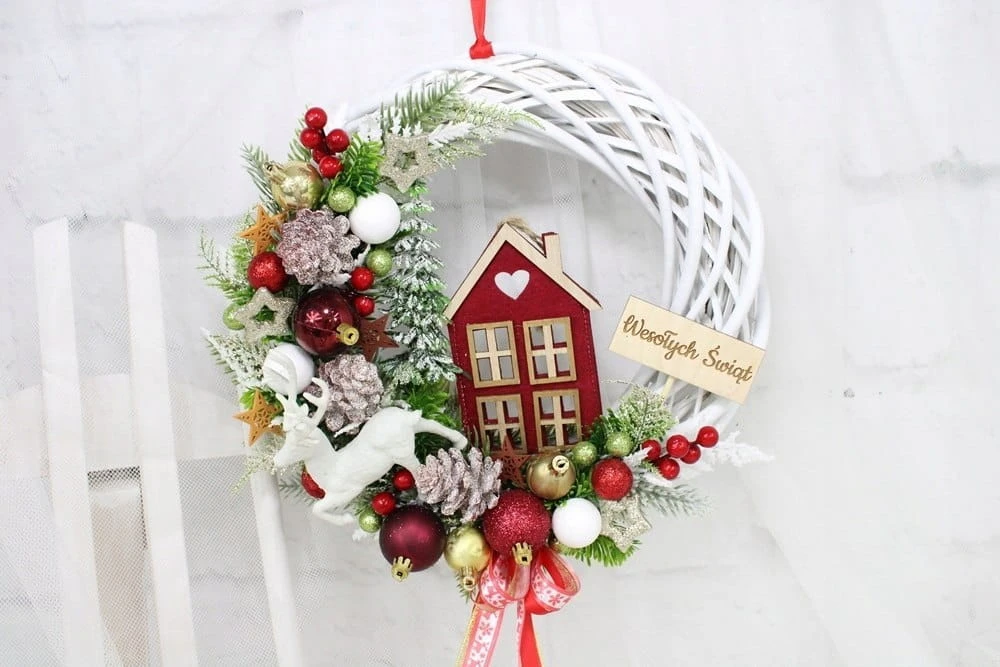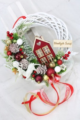 Wianek świąteczny czerwony wieniec stroik na drzwi dekoracja DOMEK