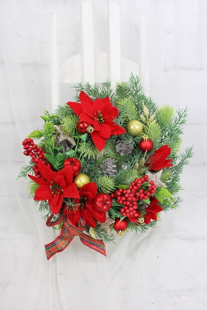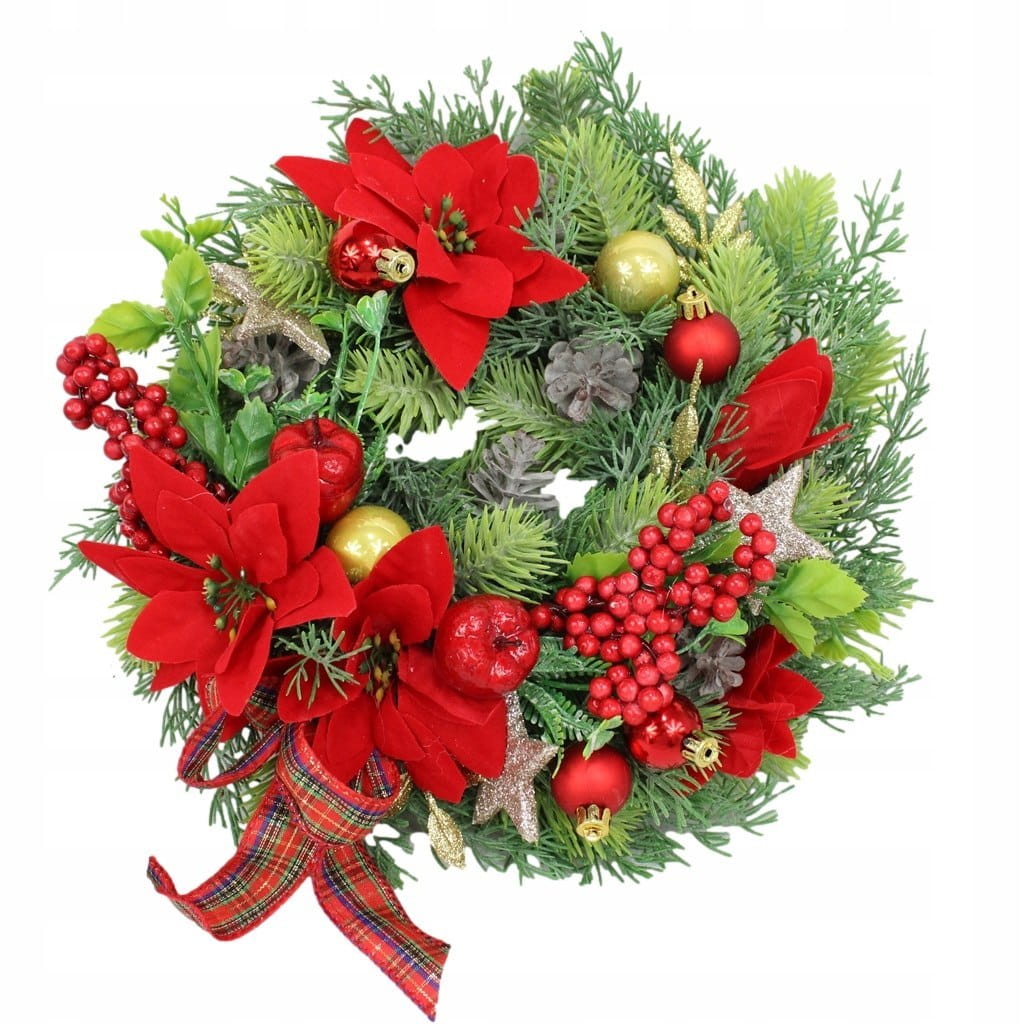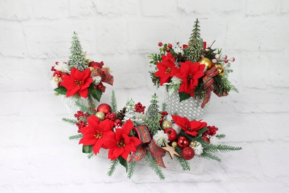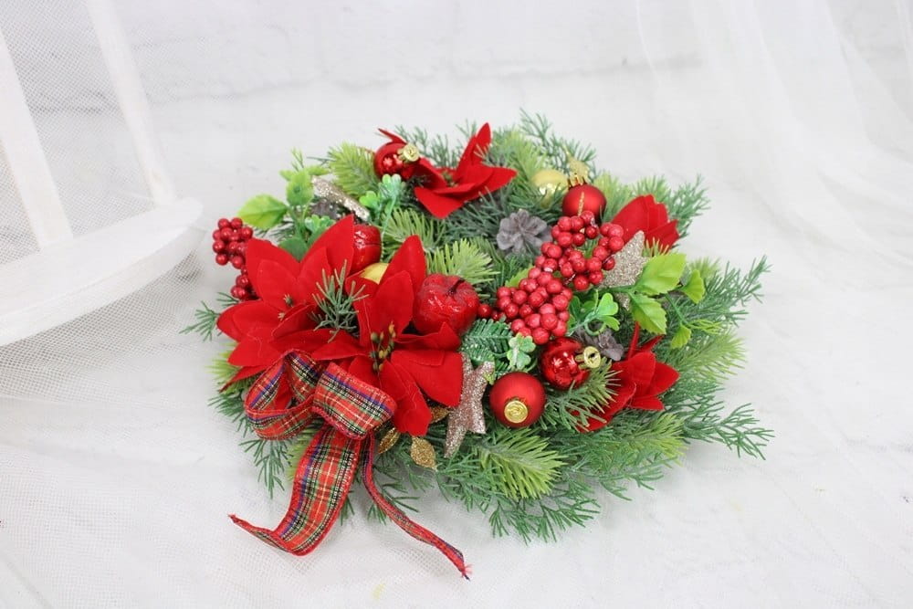 Całość jest utrzymana w tonacji czerwieni i złota, udekorowana naturalnie wyglądającymi sztucznymi gałązkami oraz pięknymi świątecznymi dodatkami, idealnie wpisująca się w trendy świąteczne..