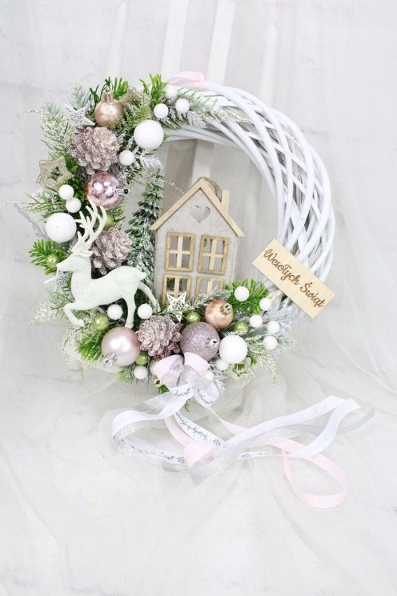 Wianek świąteczny różowy wieniec stroik na drzwi dekoracja DOMEK