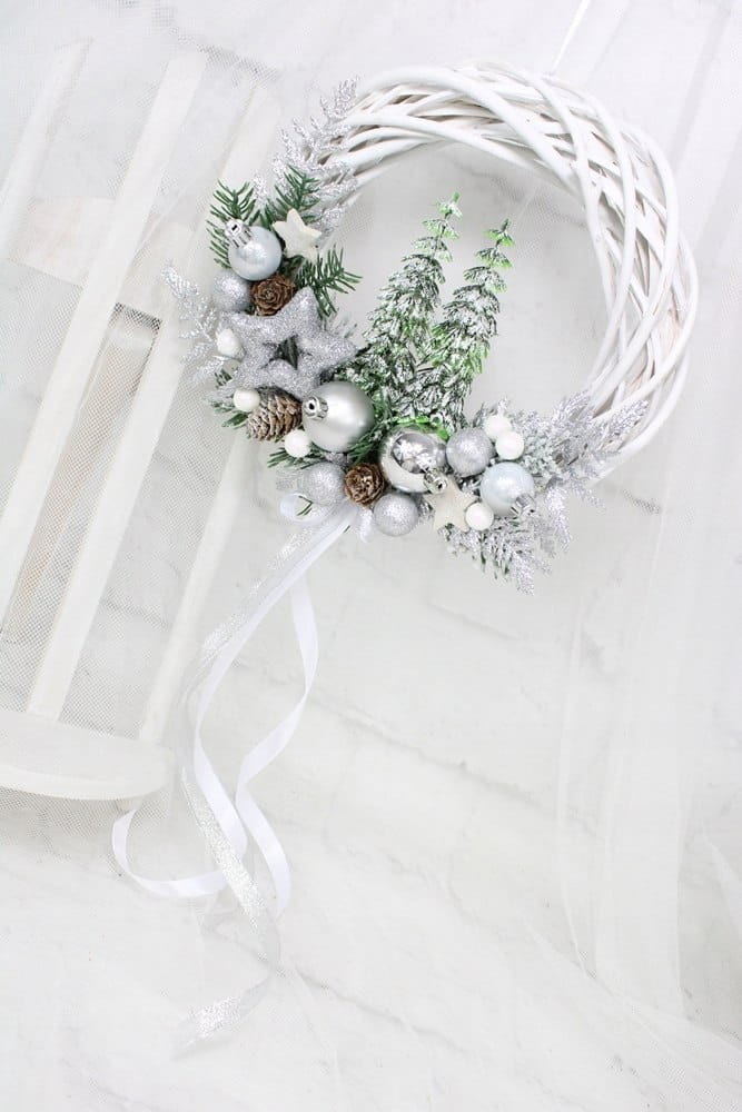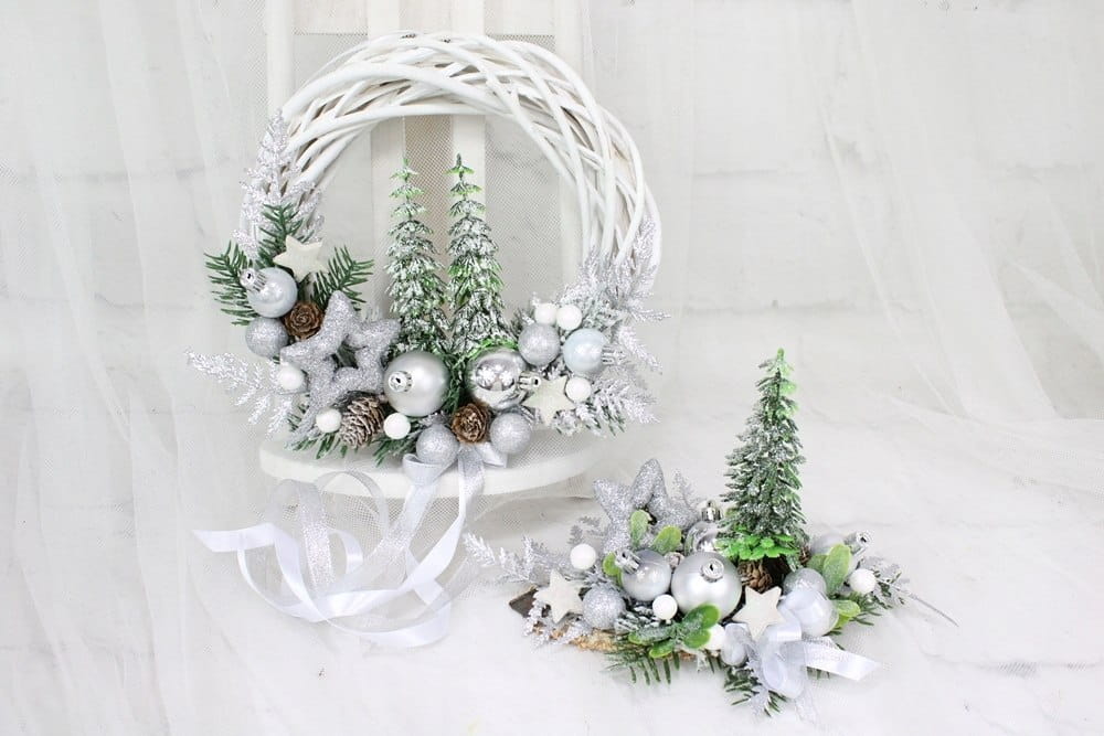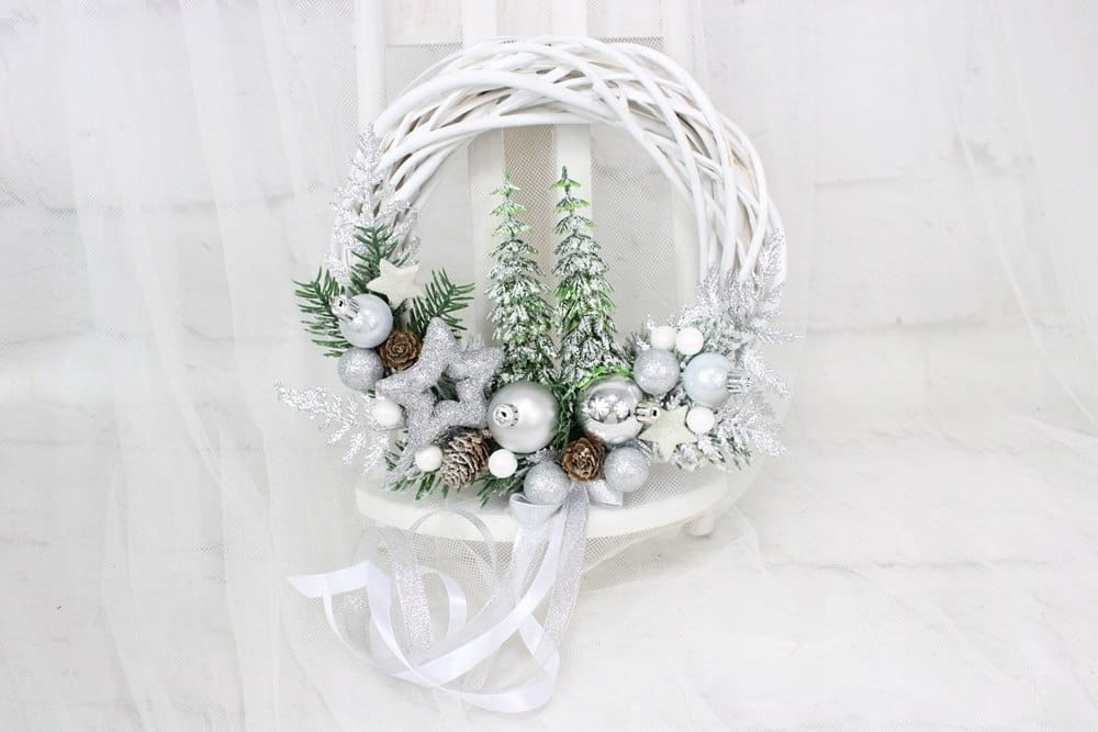 Utrzymany w srebrnej tonacji z dodatkiem zieleni dekoracyjnych gałązek i ozdób. Niezwykły dodatek stanową piękne choinki oraz kaskadowo spływająca kokarda.