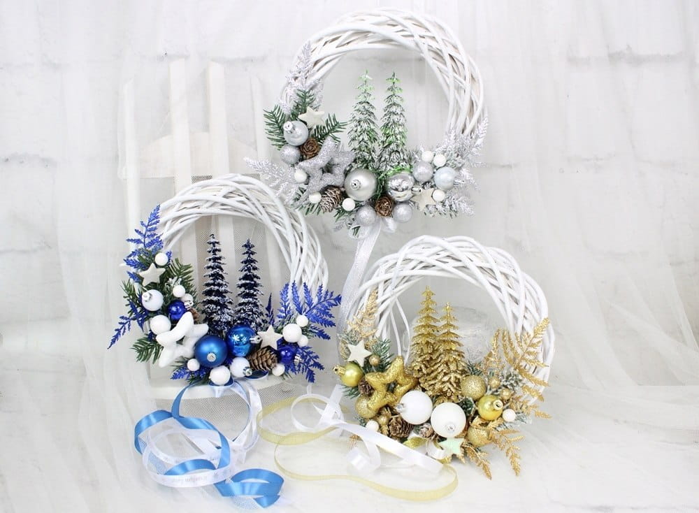 Uroczy i wyjątkowy wianuszek świąteczny wykonany z wysokiej jakości ozdób na podstawie z ratanowego przecieranego wianka.