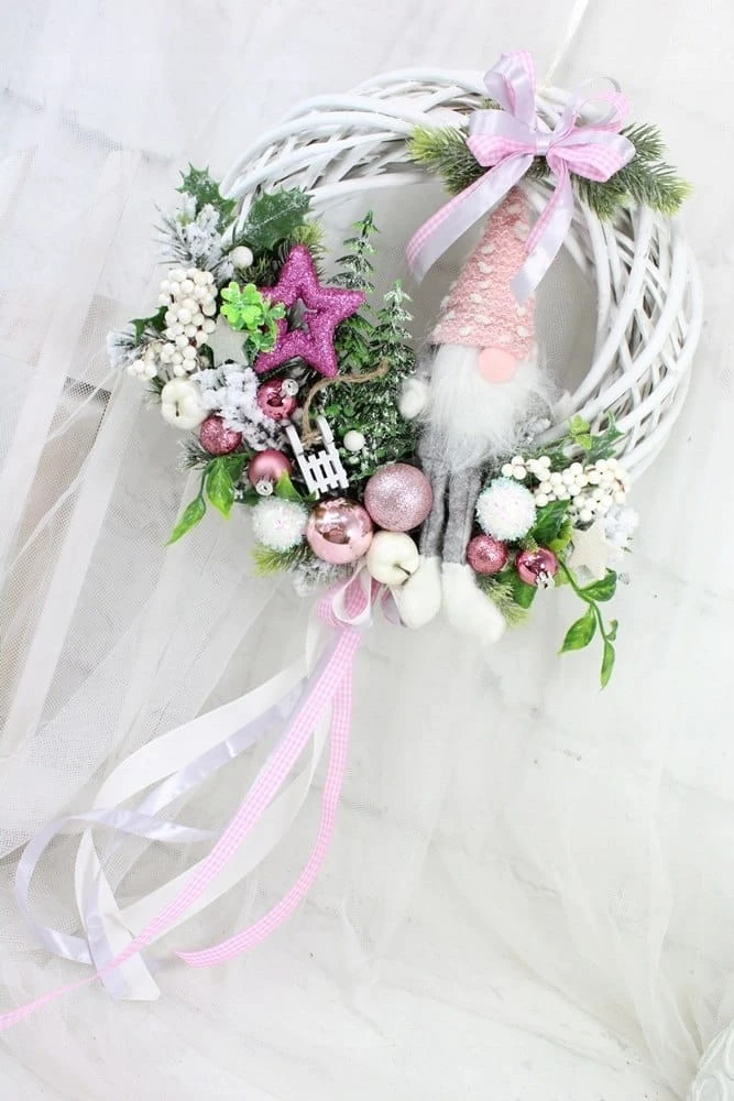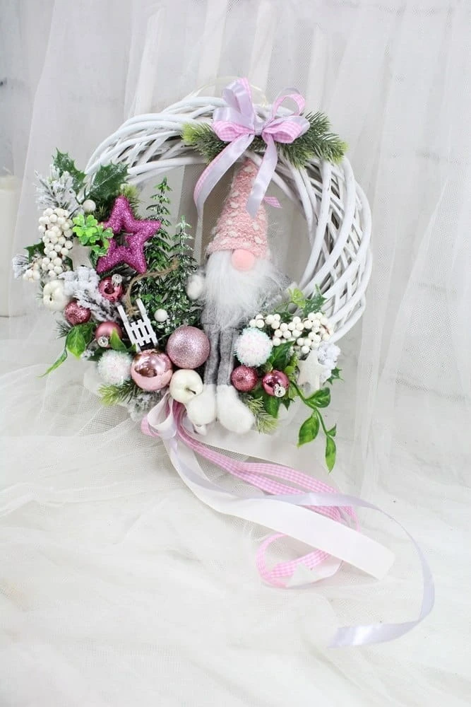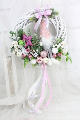 Utrzymany w tonacji różu z dodatkiem bieli i zieleni dekoracyjnych gałązek. Niezwykły dodatek stanowi piękny zimowy skrzat, kaskadowo spływająca kokarda.