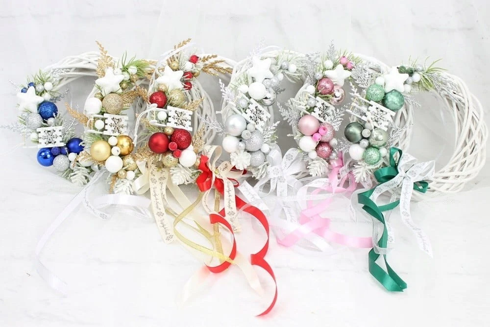 Niepowtarzalny uroczy i wyjątkowy wianuszek świąteczny wykonany z wysokiej jakości ozdób na podstawie z ratanowego wianka.