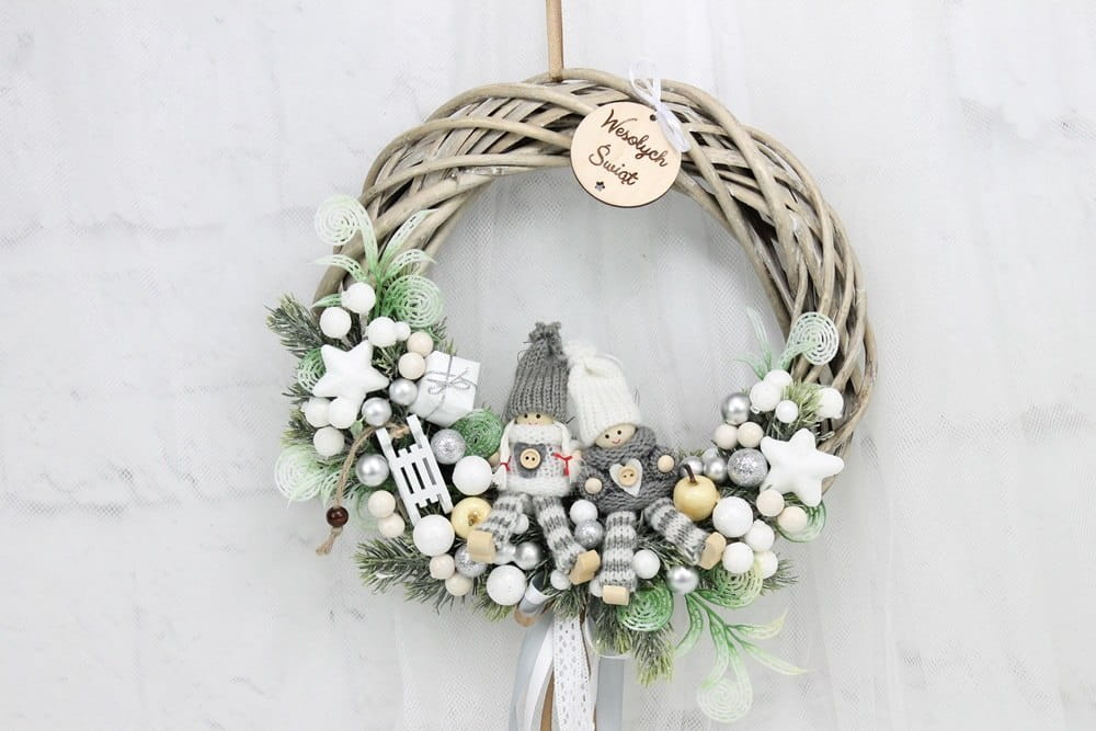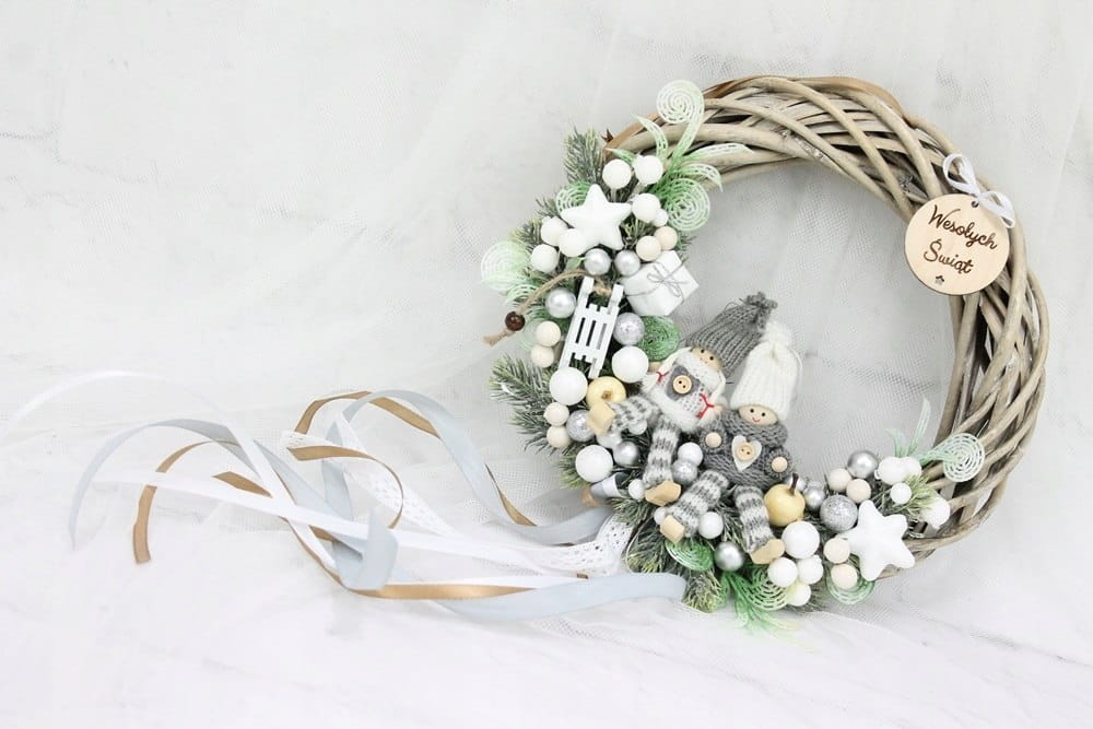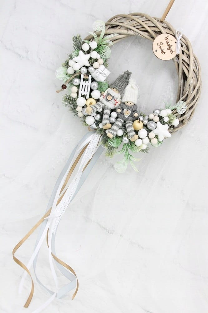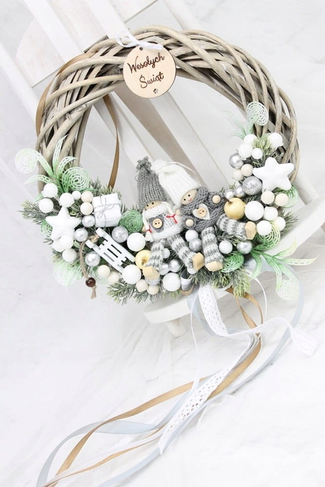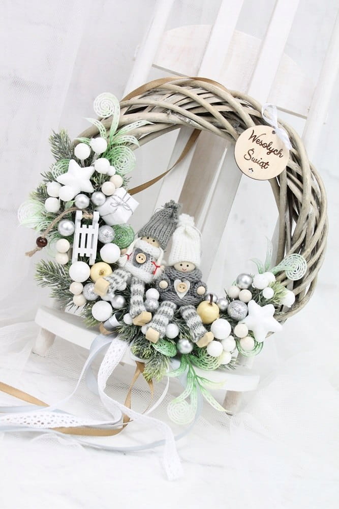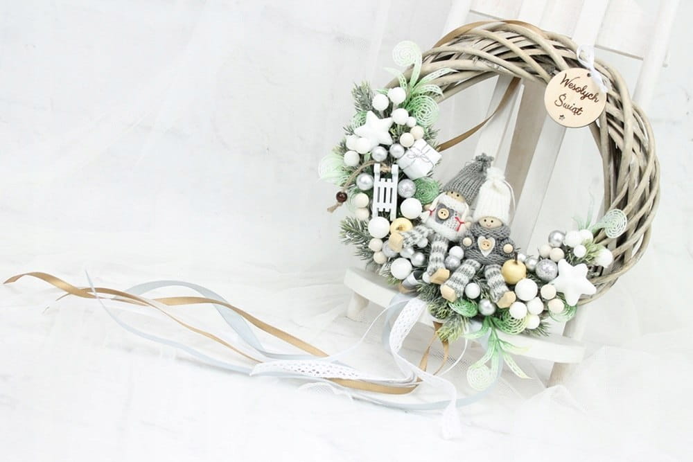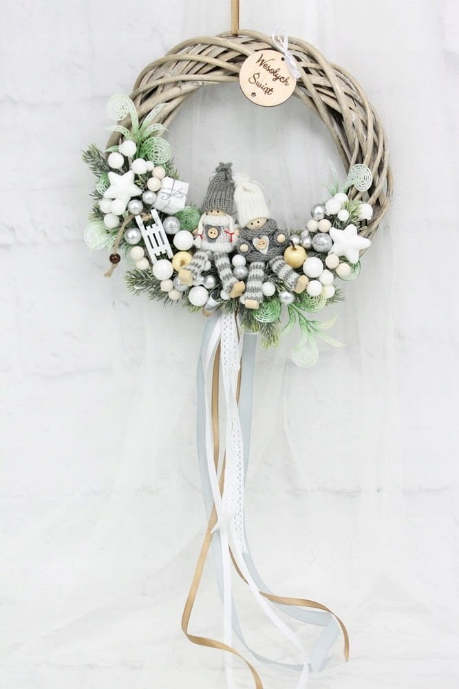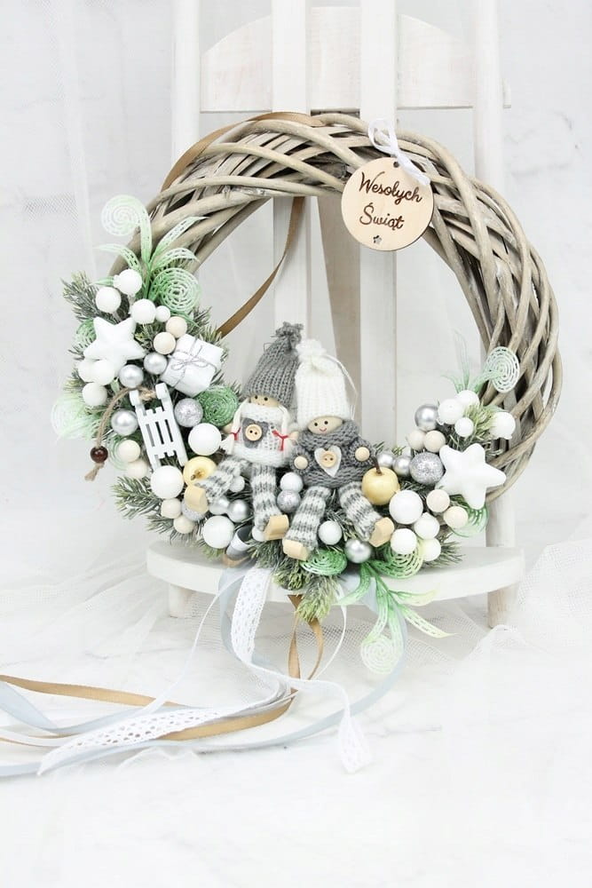 Utrzymany w tonacji bieli i srebra z dodatkiem zieleni dekoracyjnych gałązek. Niezwykły dodatek stanową piękne zimowe laleczki, kaskadowo spływająca kokarda oraz drewniany napis Wesołych Świąt.